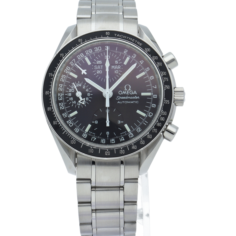 オメガの人気「スピードマスター」。クロノグラフ、月・日・曜日表示機能がついた便利な多機能ウォッチ。スタイルを選ばずにご使用いただける便利な1本。