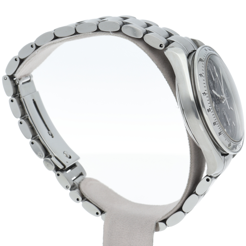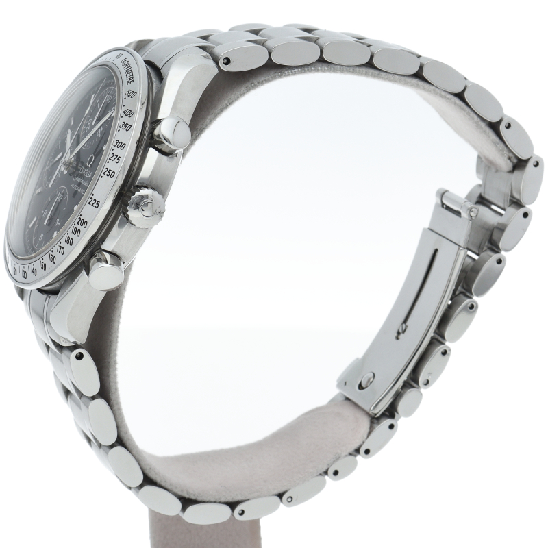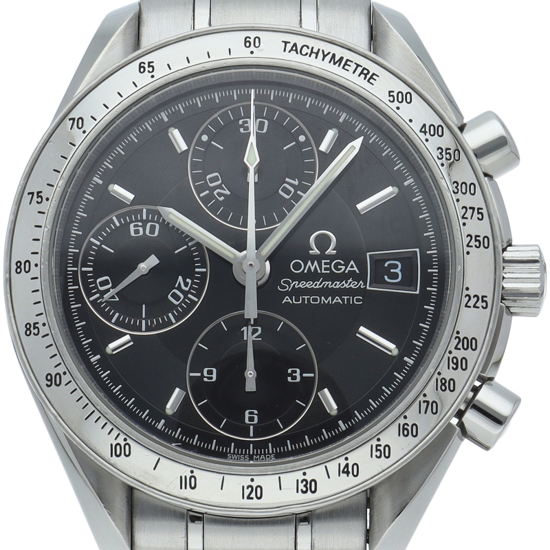 オメガの代表的な人気シリーズ「スピードマスターデイト」。クロノグラフ・デイト表示機能付きと便利で実用性のある1本です。