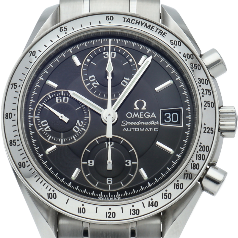 オメガの代表的な人気シリーズ「スピードマスターデイト」。クロノグラフ・デイト表示機能付きと便利で実用性のある1本です。