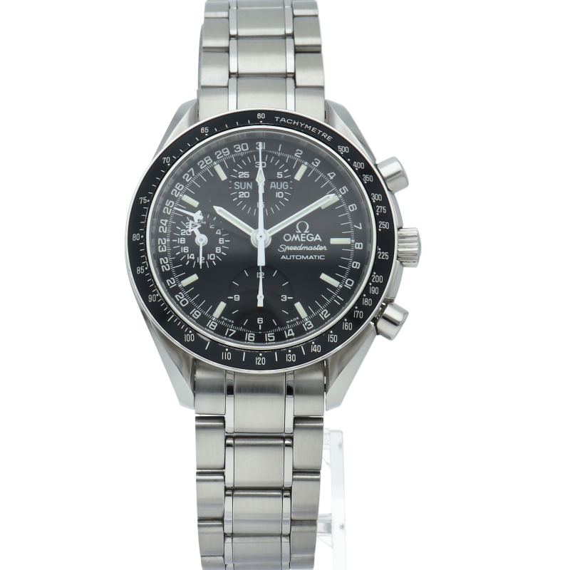 オメガの人気「スピードマスター」。クロノグラフ、月・日・曜日表示機能がついた便利な多機能ウォッチ。スタイルを選ばずにご使用いただける便利な1本。