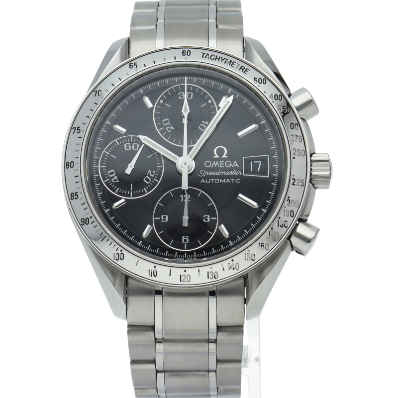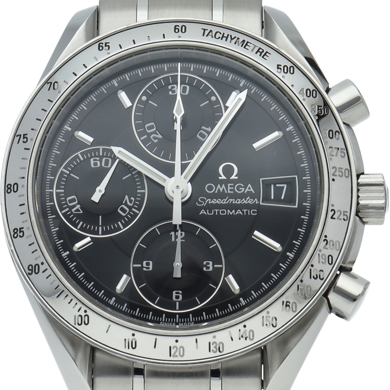 オメガの代表的な人気シリーズ「スピードマスターデイト」。クロノグラフ・デイト表示機能付きと便利で実用性のある1本です。