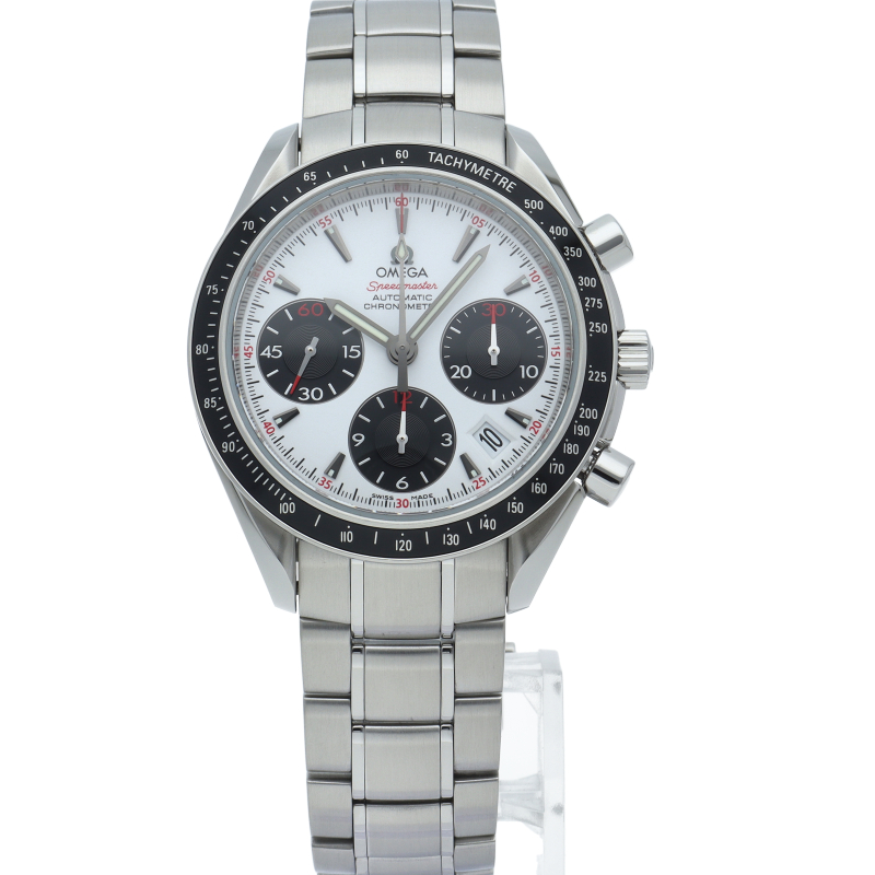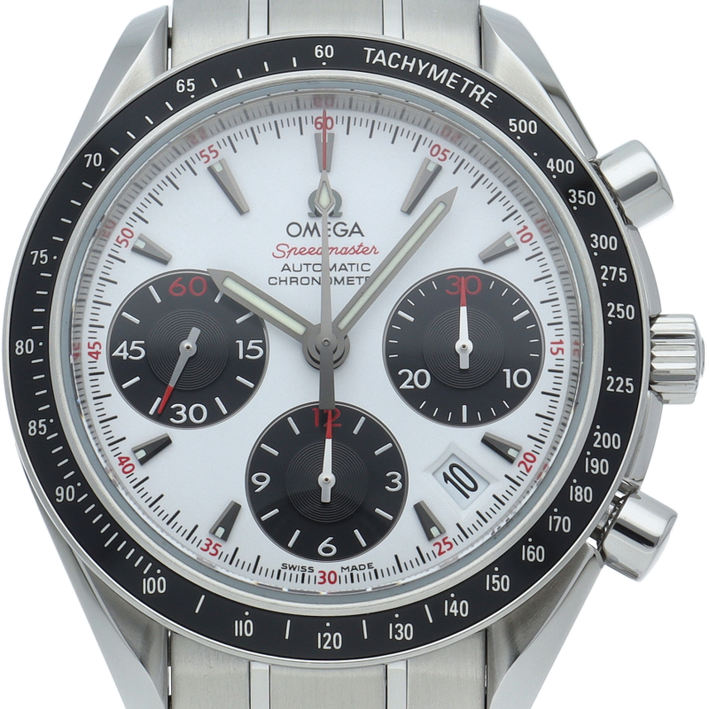 オメガの人気シリーズ「スピードマスター デイト」のクロノメーター規格をパスしたモデル。実用性とデザイン性を兼ね備えた人気の1本。