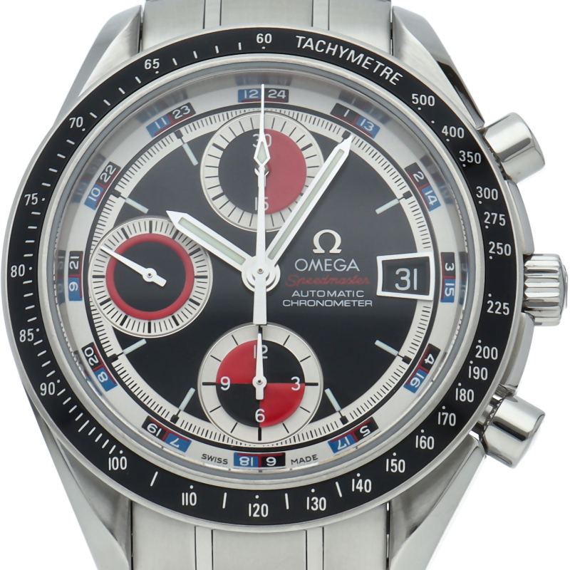 オメガの代表的な人気シリーズ「スピードマスター デイト」。クロノグラフ・デイト表示機能付きと便利で実用性のある1本です。カラフルな文字盤色が、まわりと少し差を付けたい方にうってつけの1本です。