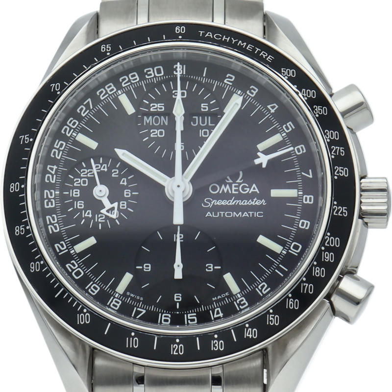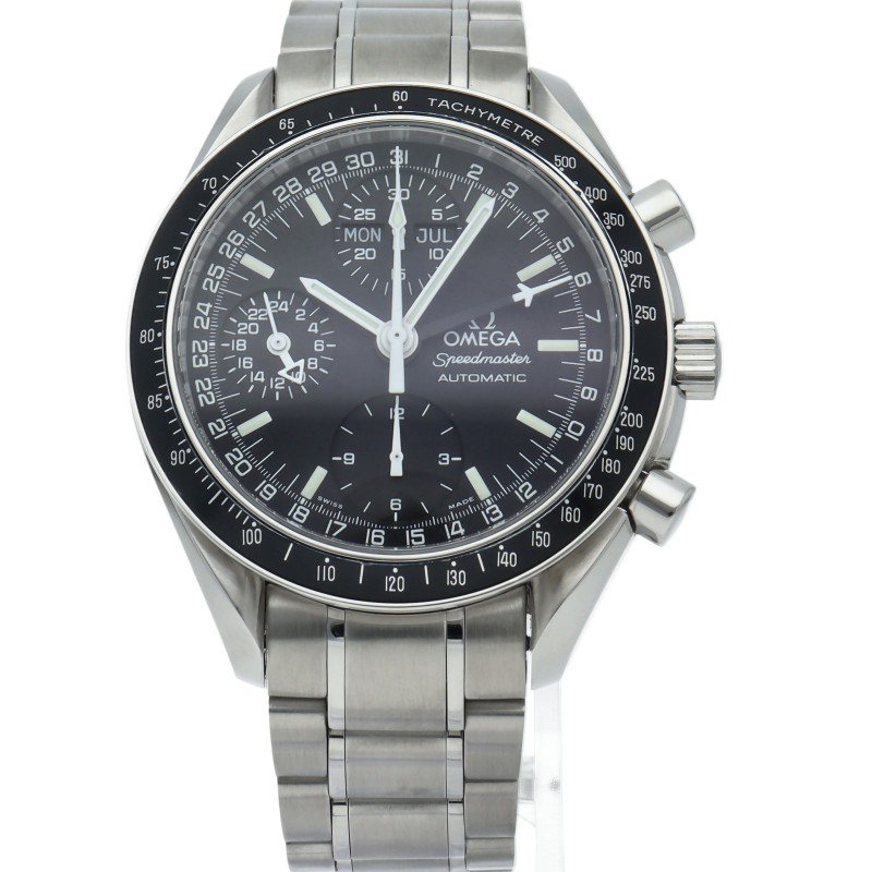 オメガの人気「スピードマスター」。クロノグラフ、月・日・曜日表示機能がついた便利な多機能ウォッチ。スタイルを選ばずにご使用いただける便利な1本。