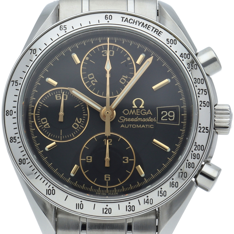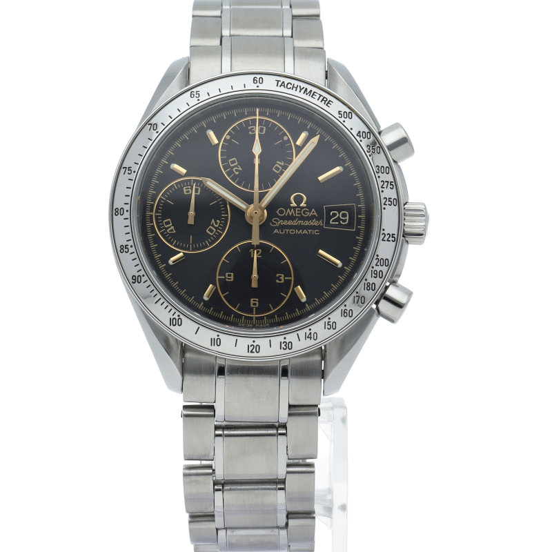 オメガの代表的な人気シリーズ「スピードマスター・デイト」。クロノグラフ・デイト表示機能付きと便利で実用性のある1本です。日本限定のインデックスがゴールドの人気モデルです。