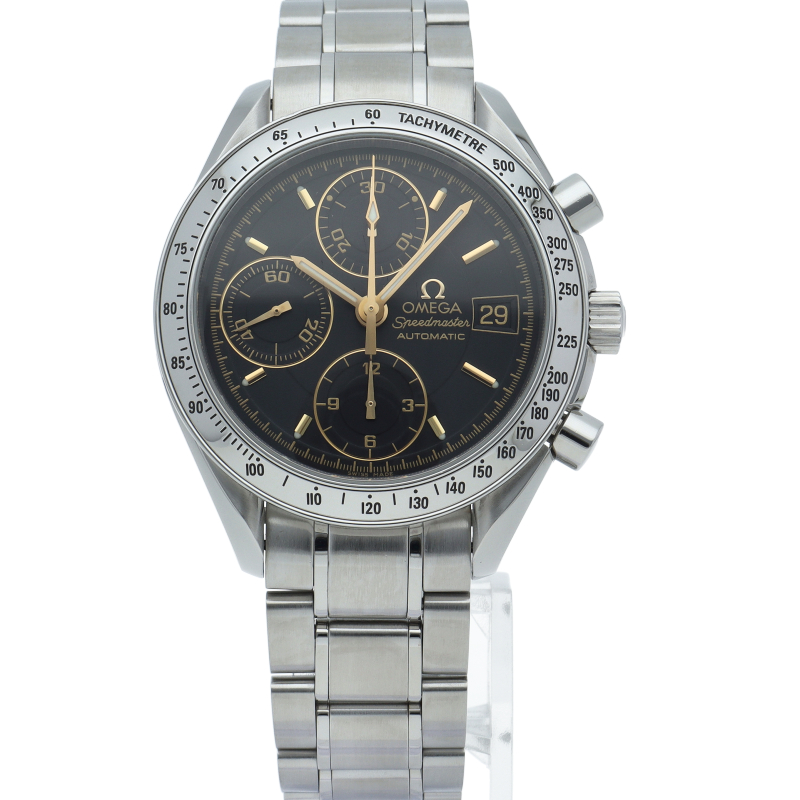 オメガの代表的な人気シリーズ「スピードマスター・デイト」。クロノグラフ・デイト表示機能付きと便利で実用性のある1本です。日本限定のインデックスがゴールドの人気モデルです。