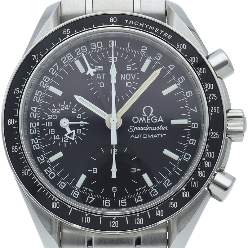 オメガの人気「スピードマスター」。クロノグラフ、月・日・曜日表示機能がついた便利な多機能ウォッチ。スタイルを選ばずにご使用いただける便利な1本。