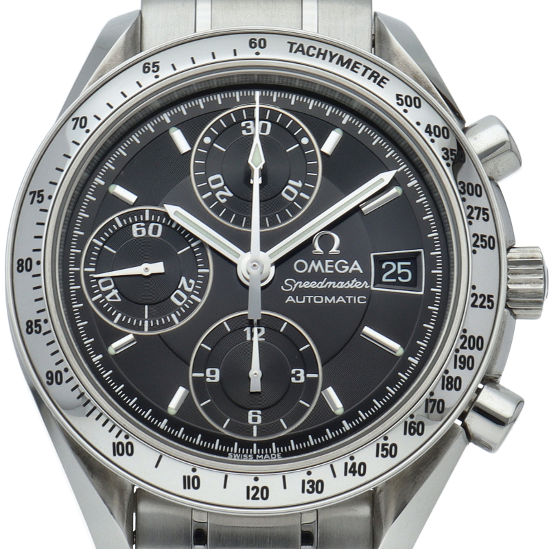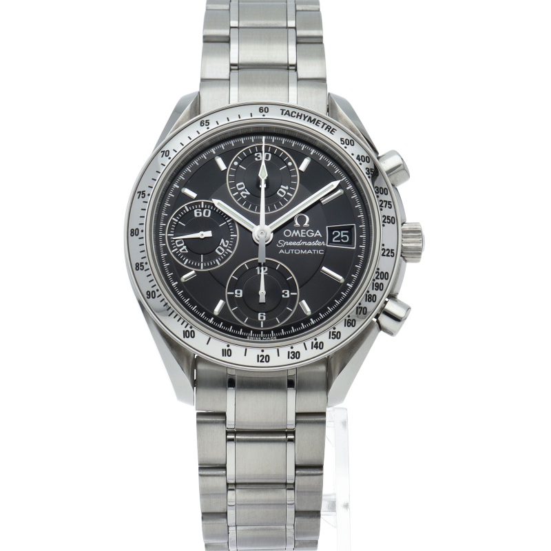 オメガの代表的な人気シリーズ「スピードマスターデイト」。クロノグラフ・デイト表示機能付きと便利で実用性のある1本です。