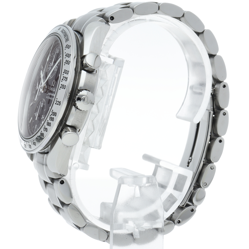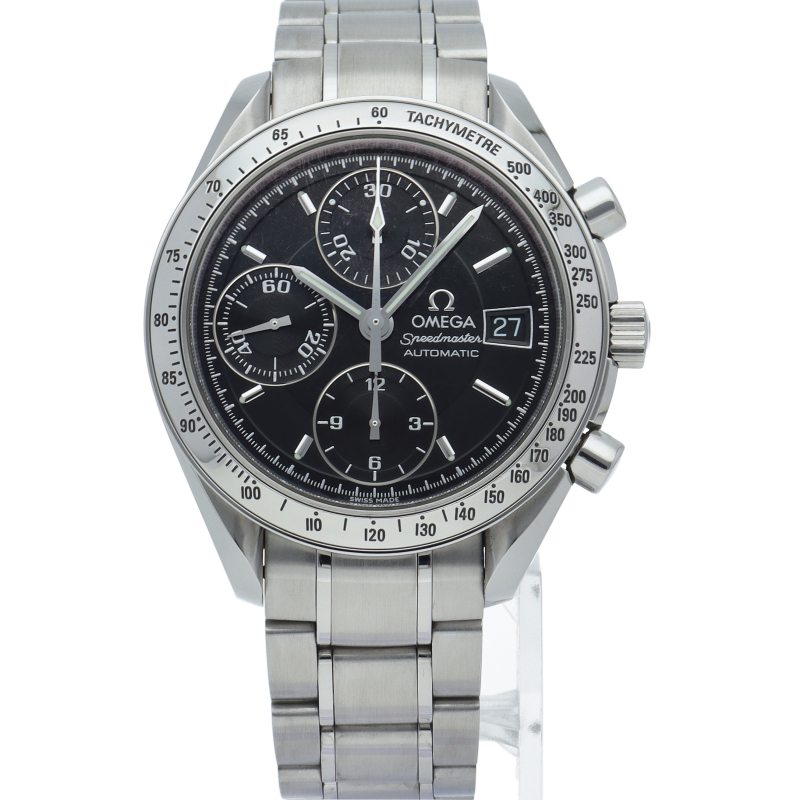 オメガの代表的な人気シリーズ「スピードマスターデイト」。クロノグラフ・デイト表示機能付きと便利で実用性のある1本です。