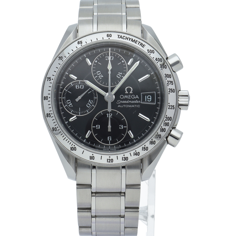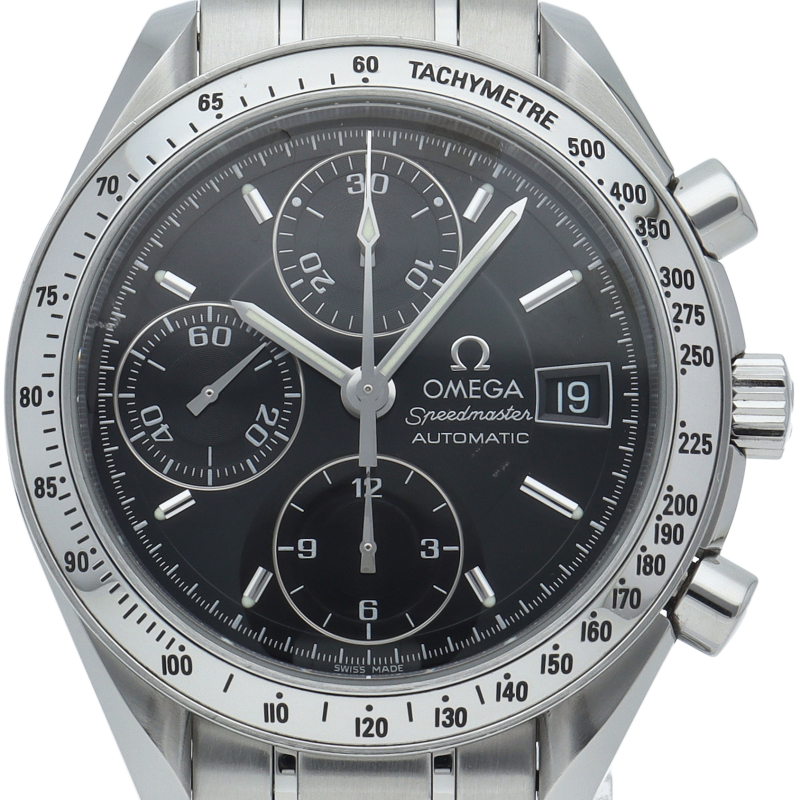 オメガの代表的な人気シリーズ「スピードマスターデイト」。クロノグラフ・デイト表示機能付きと便利で実用性のある1本です。