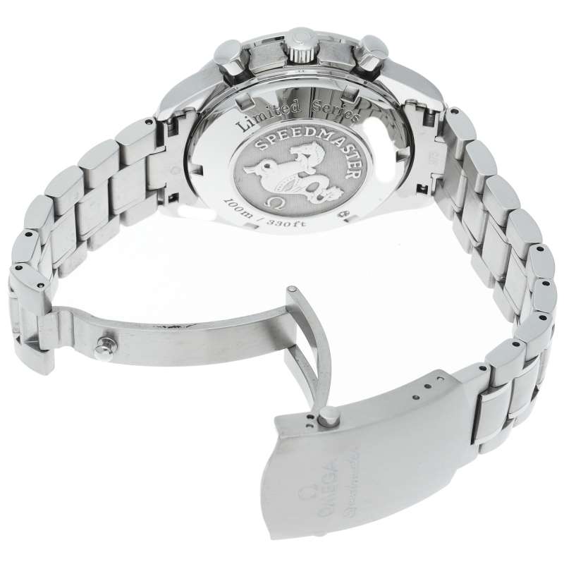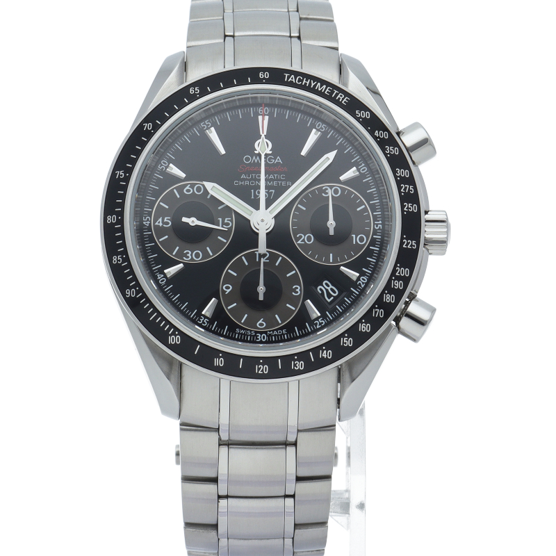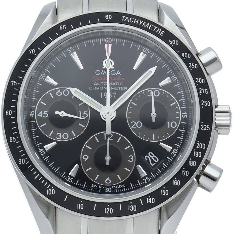 2009年に発売された日本限定モデルです。横三つ目のインダイヤル、4-5時位置に配置されたカレンダー、スピードマスター誕生の年である“1957”が表記されるなど、限定モデルらしいデザインです。