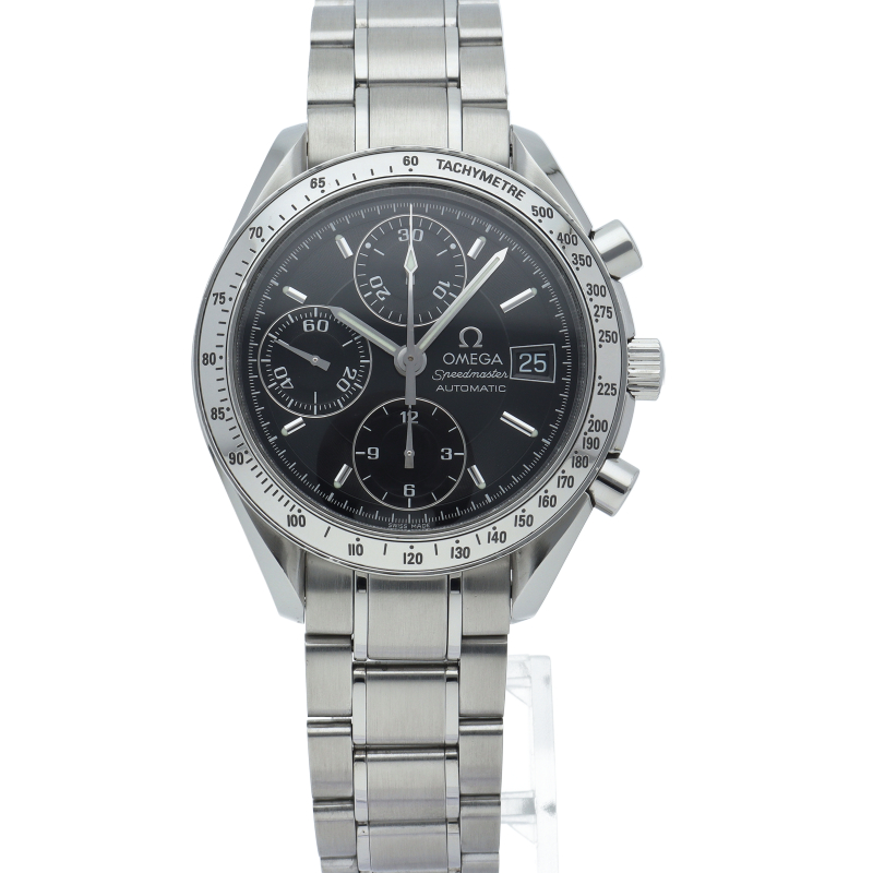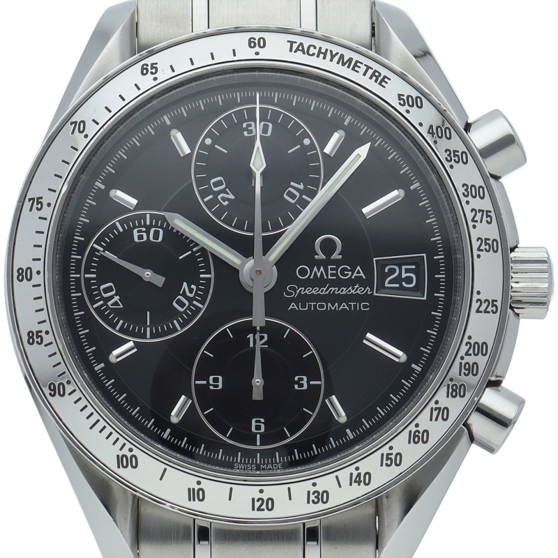 オメガの代表的な人気シリーズ「スピードマスターデイト」。クロノグラフ・デイト表示機能付きと便利で実用性のある1本です。