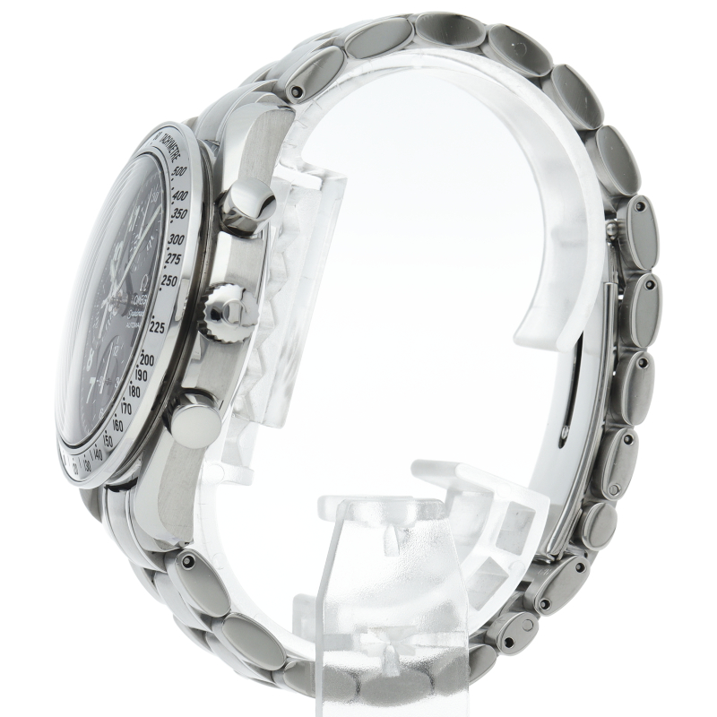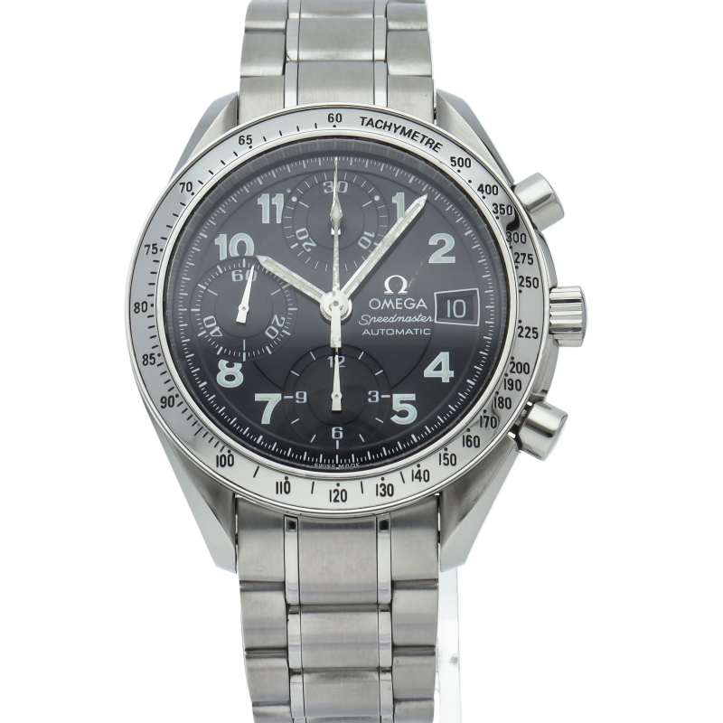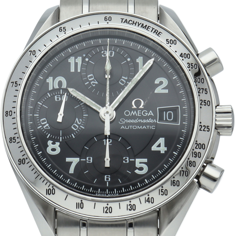 オメガの代表的な人気シリーズ「スピードマスター・デイト」。クロノグラフ・デイト表示機能付きと便利で実用性のある1本です。ブラックフェイスにアラビア数字のインデックスを配した日本限定モデルです。