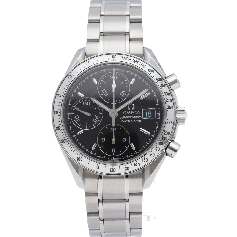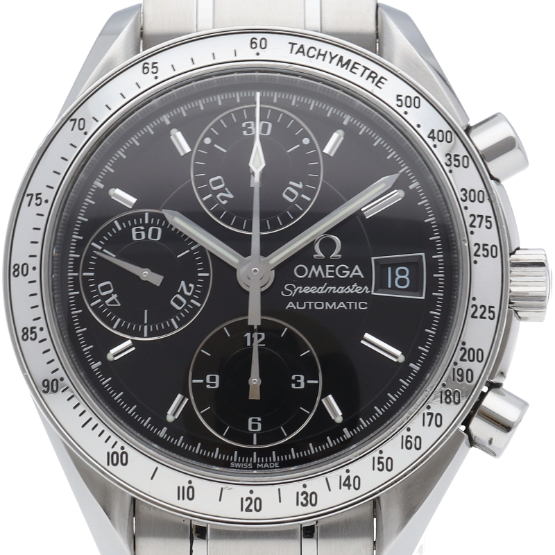 オメガの代表的な人気シリーズ「スピードマスターデイト」。クロノグラフ・デイト表示機能付きと便利で実用性のある1本です。