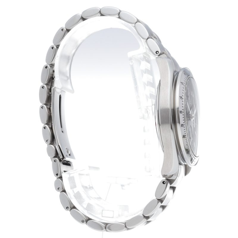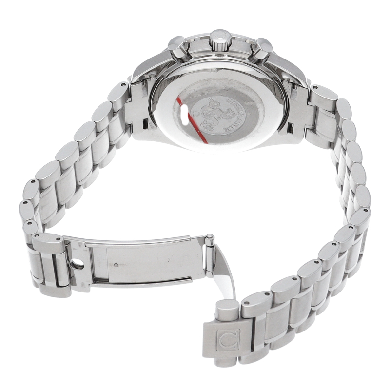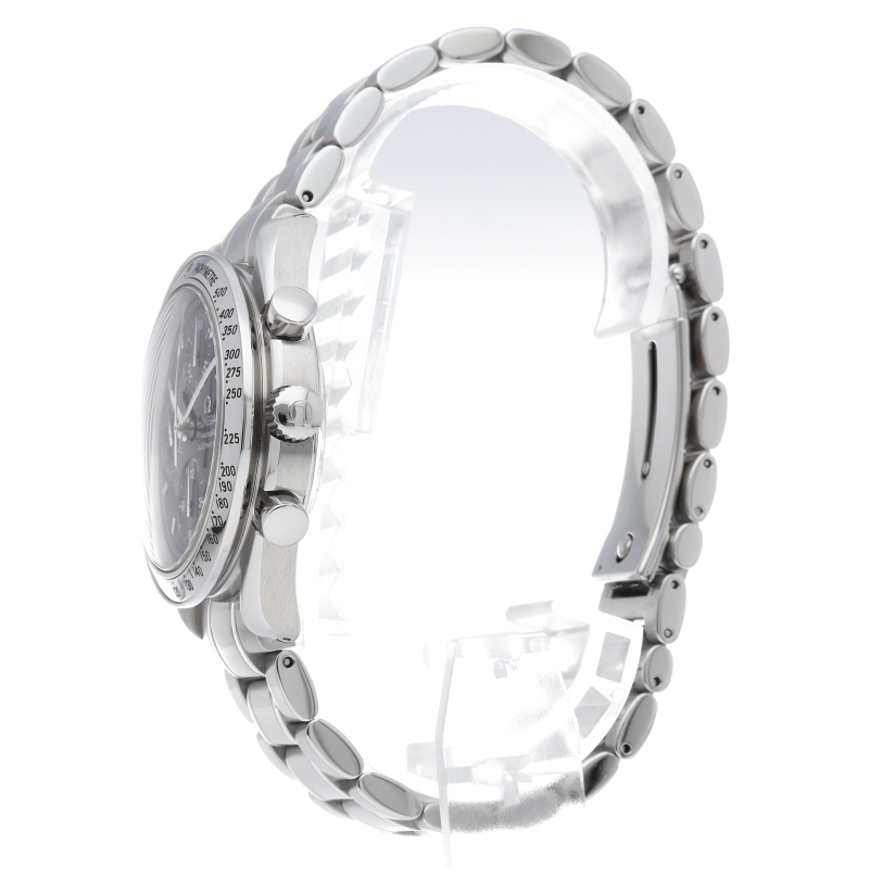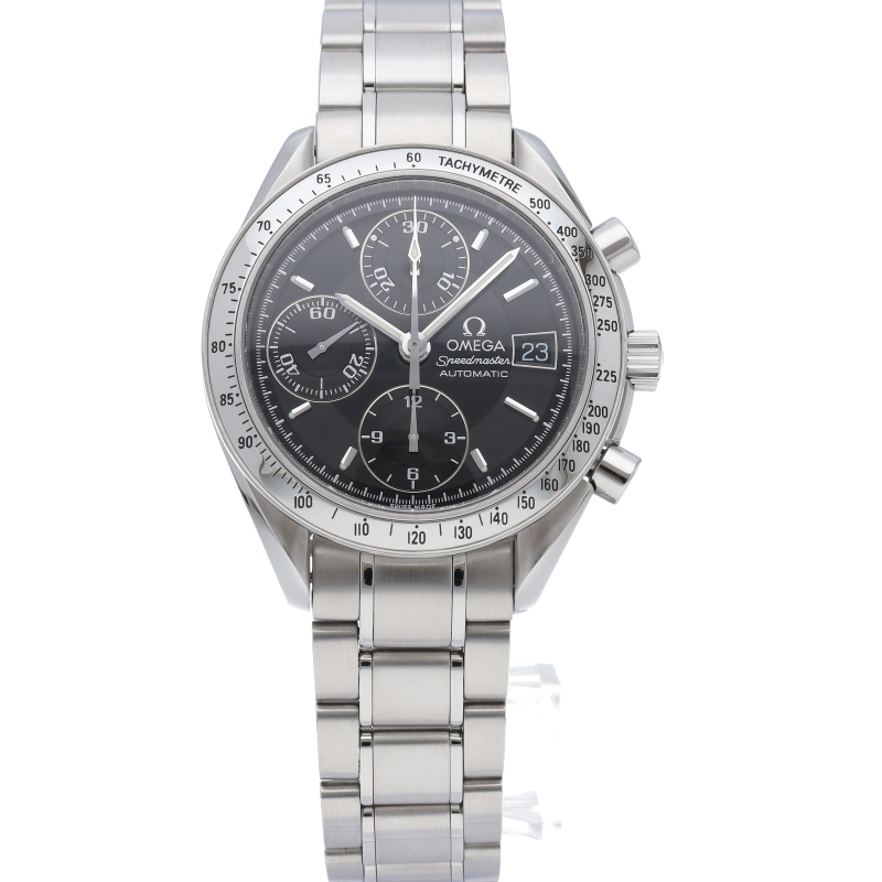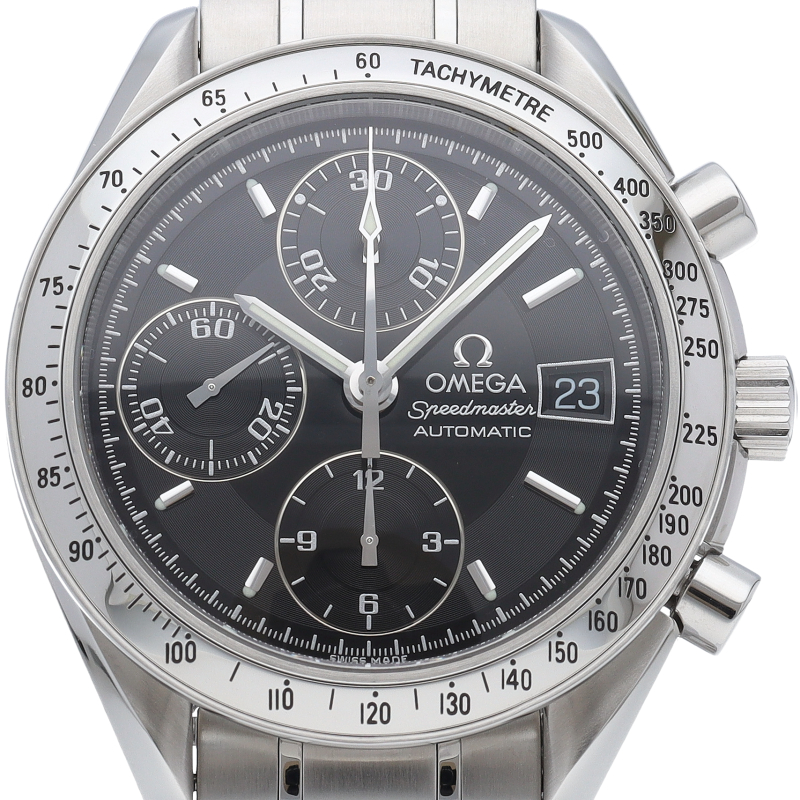 オメガの代表的な人気シリーズ「スピードマスターデイト」。クロノグラフ・デイト表示機能付きと便利で実用性のある1本です。