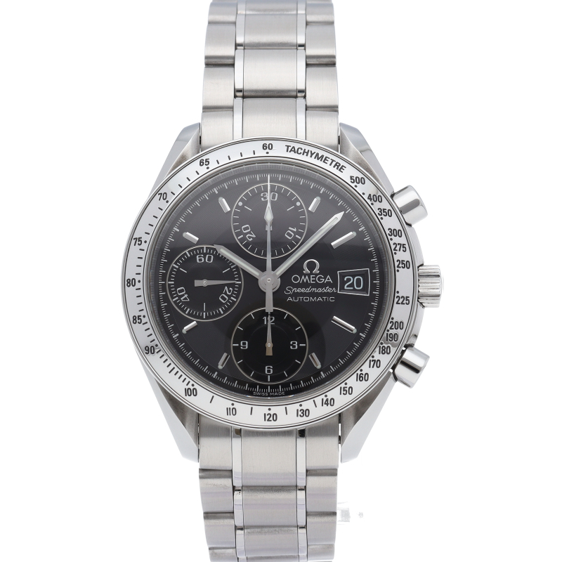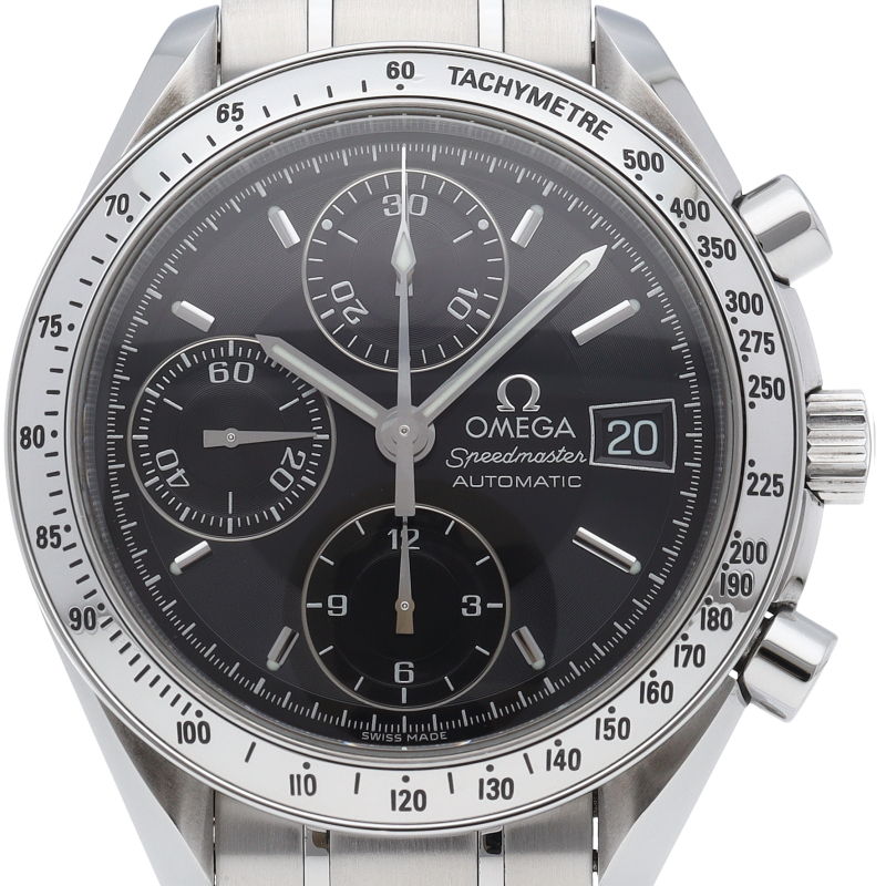 オメガの代表的な人気シリーズ「スピードマスターデイト」。クロノグラフ・デイト表示機能付きと便利で実用性のある1本です。