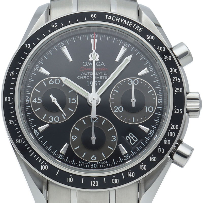 2009年に発売された日本限定モデルです。横三つ目のインダイヤル、4-5時位置に配置されたカレンダー、スピードマスター誕生の年である“1957”が表記されるなど、限定モデルらしいデザインです。