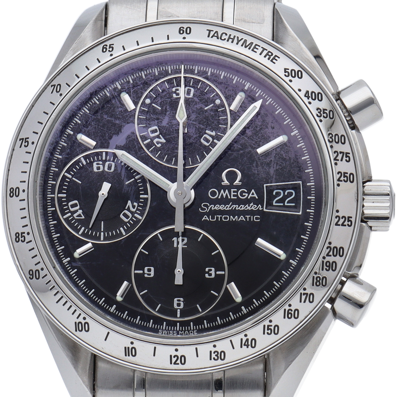 オメガの代表的な人気シリーズ「スピードマスターデイト」。クロノグラフ・デイト表示機能付きと便利で実用性のある1本です。