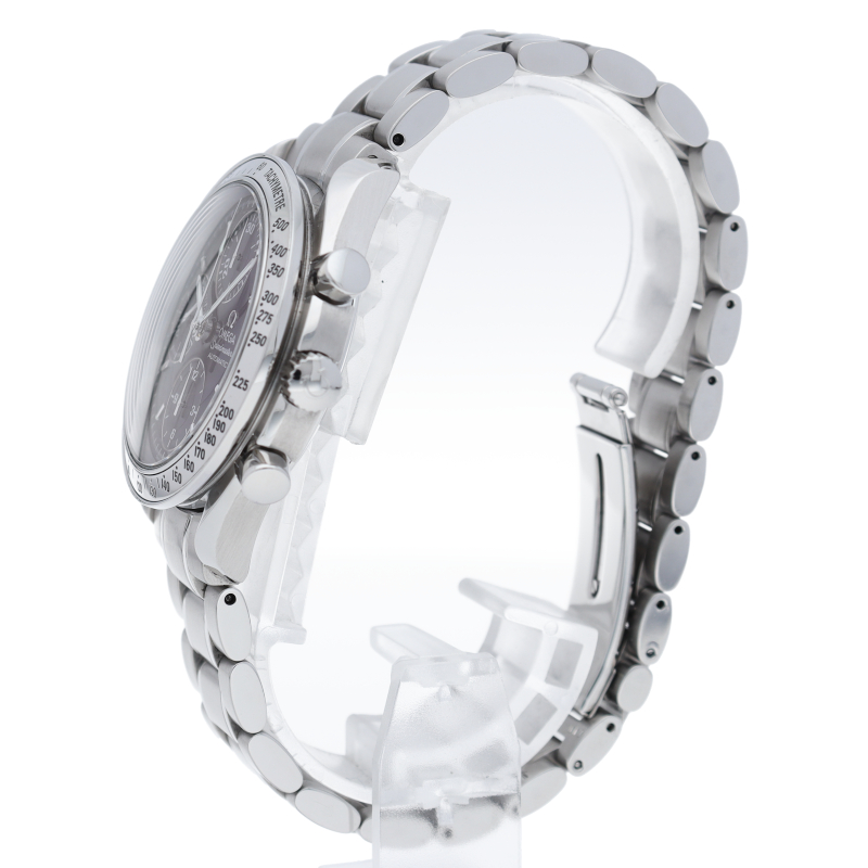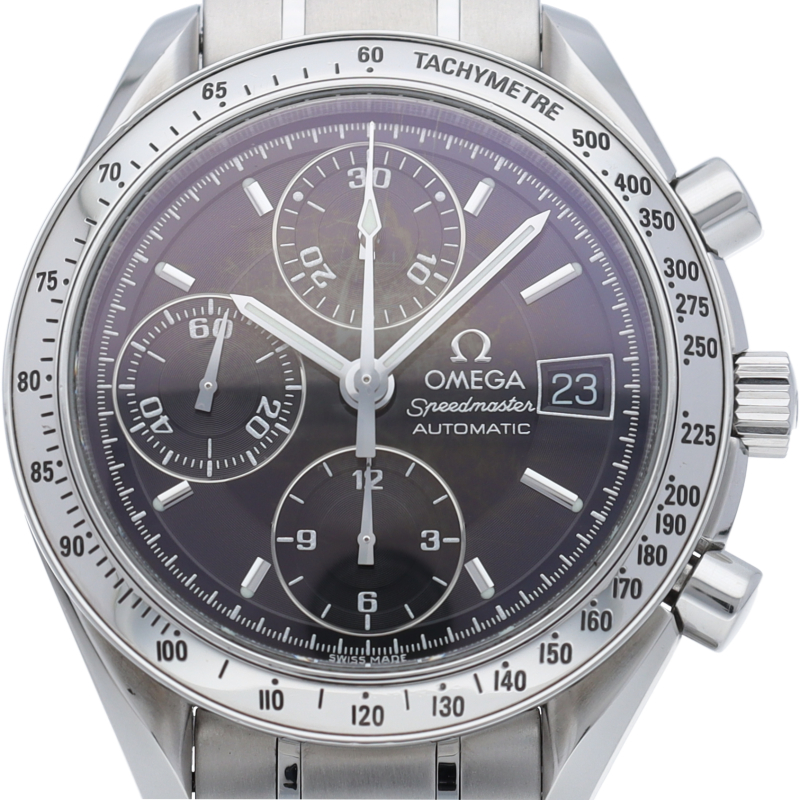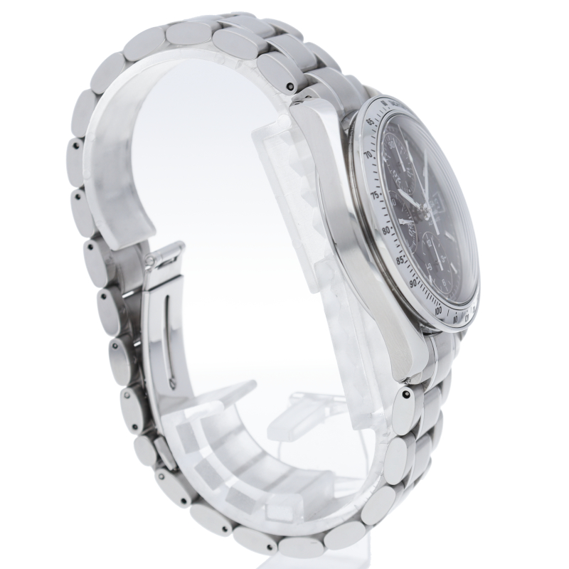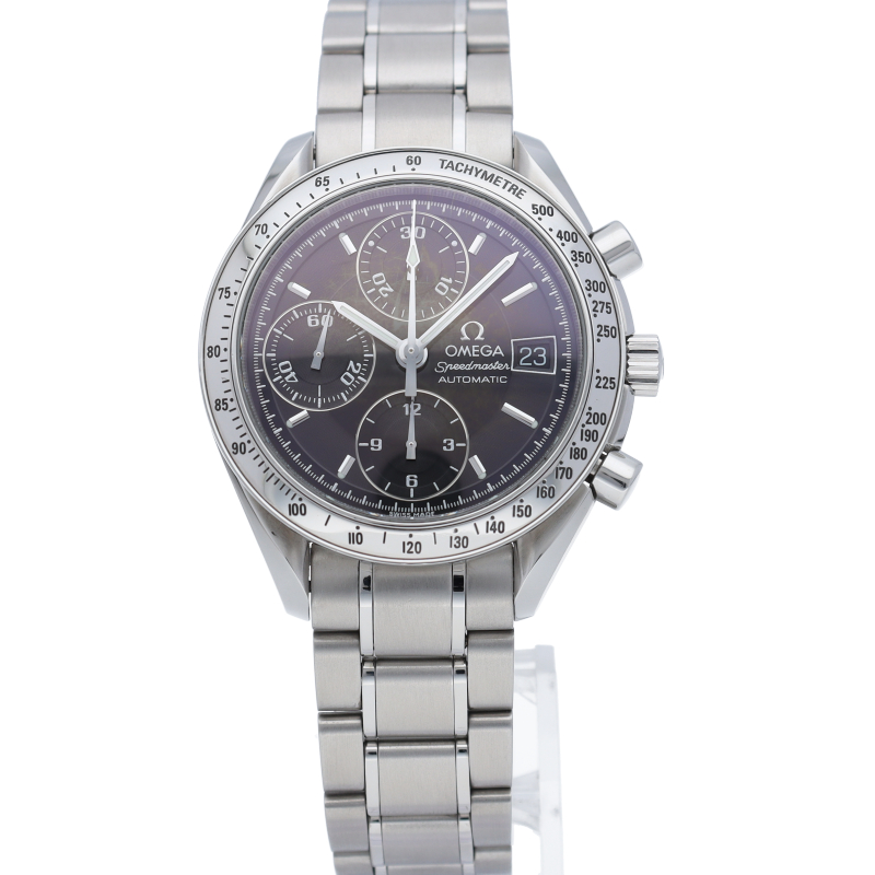オメガの代表的な人気シリーズ「スピードマスターデイト」。クロノグラフ・デイト表示機能付きと便利で実用性のある1本です。