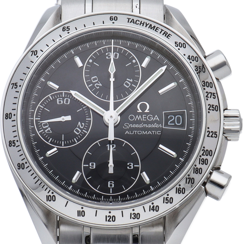 オメガの代表的な人気シリーズ「スピードマスターデイト」。クロノグラフ・デイト表示機能付きと便利で実用性のある1本です。