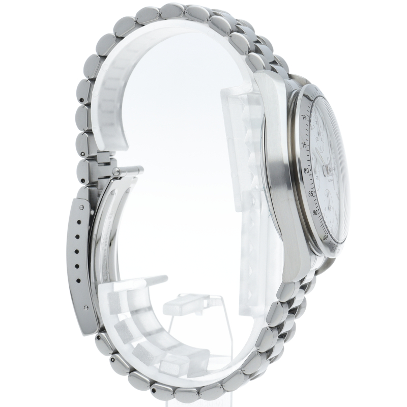 現行ラインでは白文字盤のバリエーションは少ないですので、このモデルは希少と言えるかもしれません。デザイン的にはまさにクロノグラフのお手本のような基本に忠実なデザインですので、オンオフ問わず活躍してくれると思います。