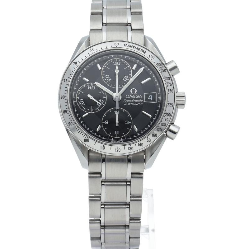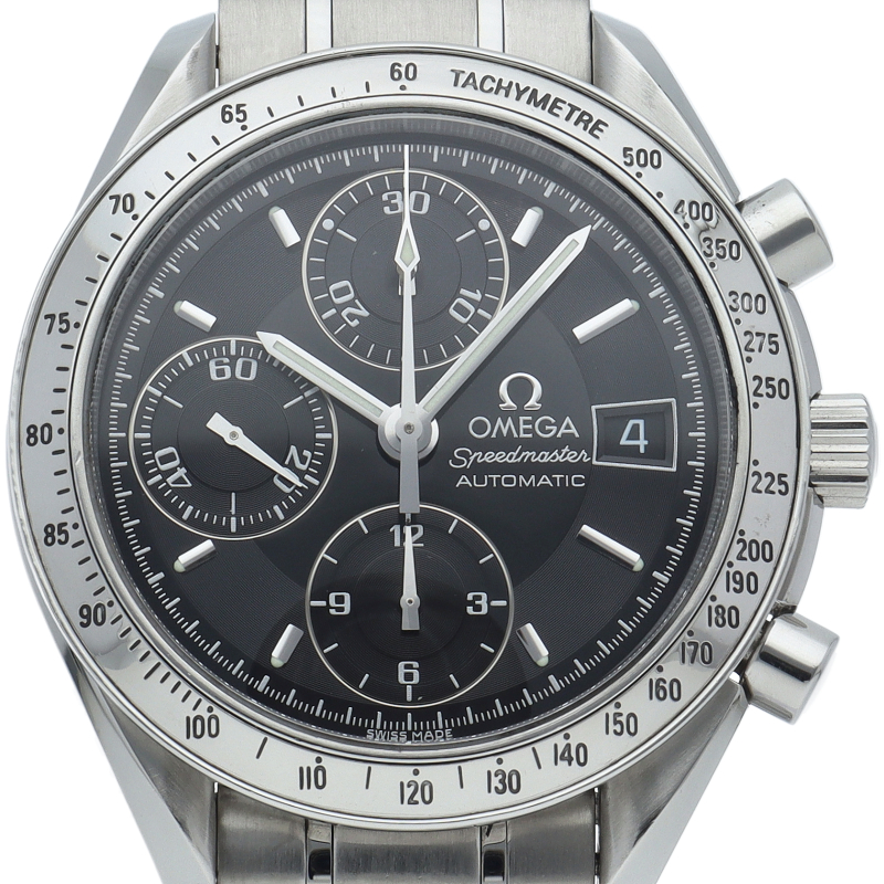 オメガの代表的な人気シリーズ「スピードマスターデイト」。クロノグラフ・デイト表示機能付きと便利で実用性のある1本です。