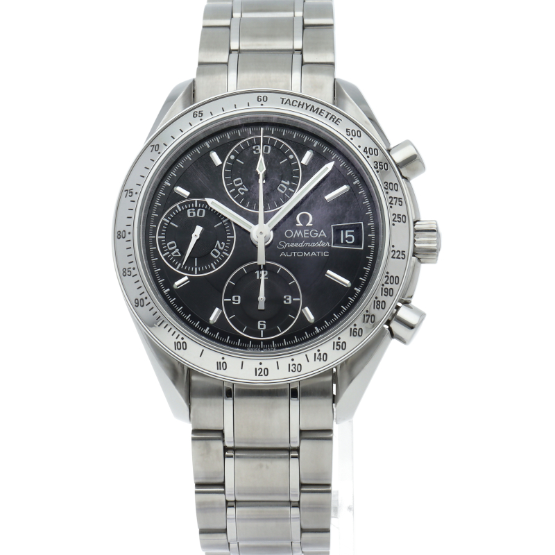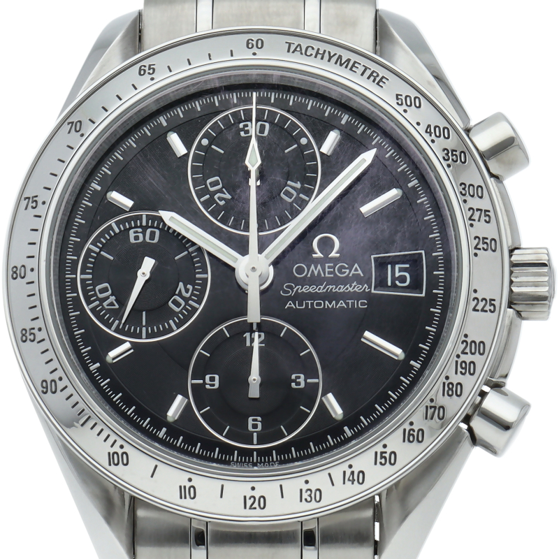 オメガの代表的な人気シリーズ「スピードマスターデイト」。クロノグラフ・デイト表示機能付きと便利で実用性のある1本です。