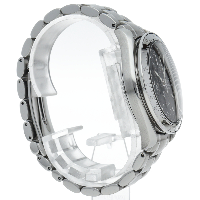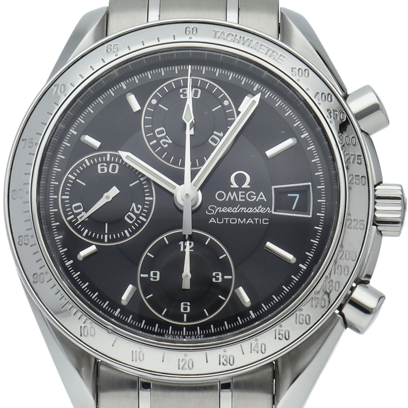オメガの代表的な人気シリーズ「スピードマスターデイト」。クロノグラフ・デイト表示機能付きと便利で実用性のある1本です。