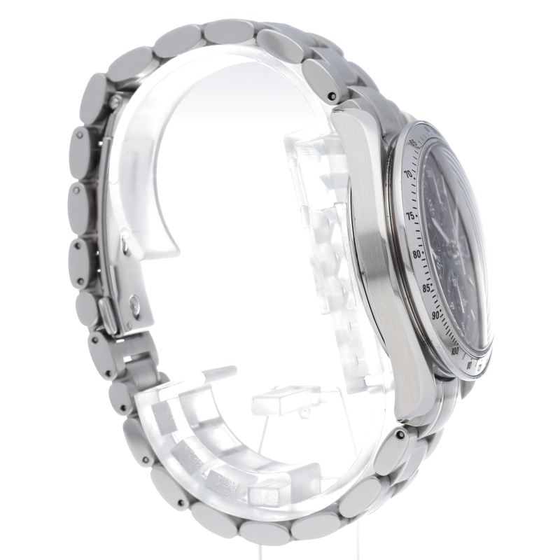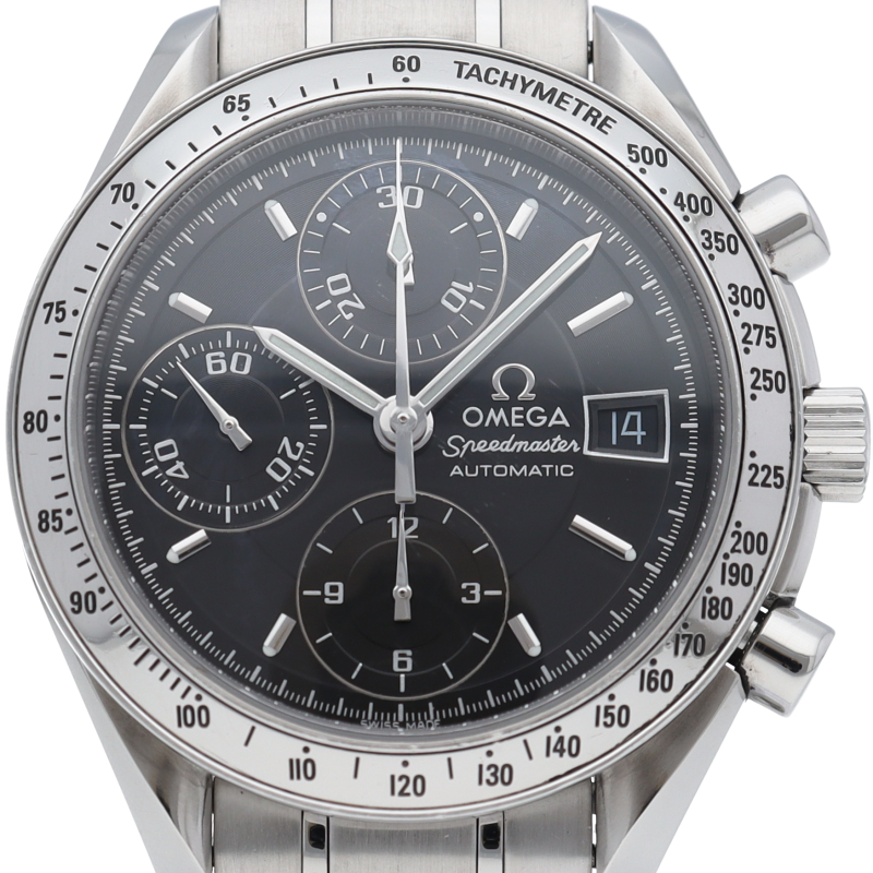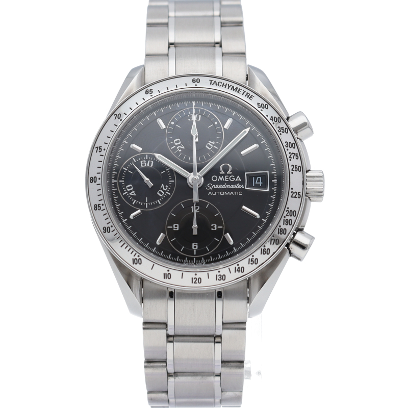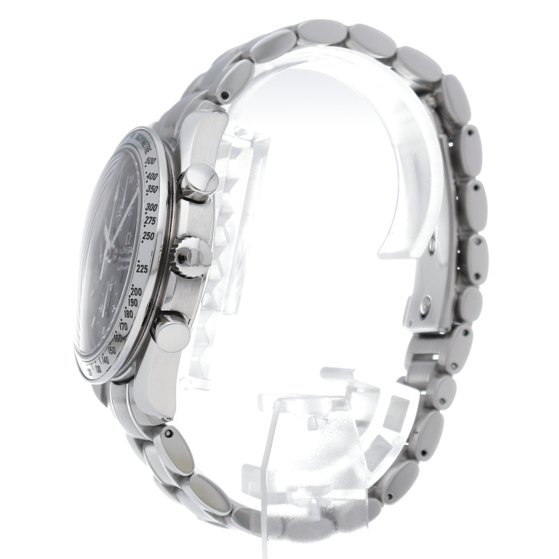 オメガの代表的な人気シリーズ「スピードマスターデイト」。クロノグラフ・デイト表示機能付きと便利で実用性のある1本です。