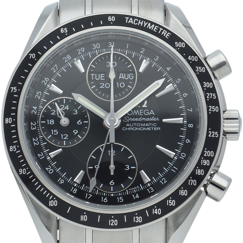 オメガの人気「スピードマスター」。クロノグラフ、月・日・曜日表示機能がついた便利な多機能ウォッチ。モデルチェンジに伴い高級感がアップした1本。