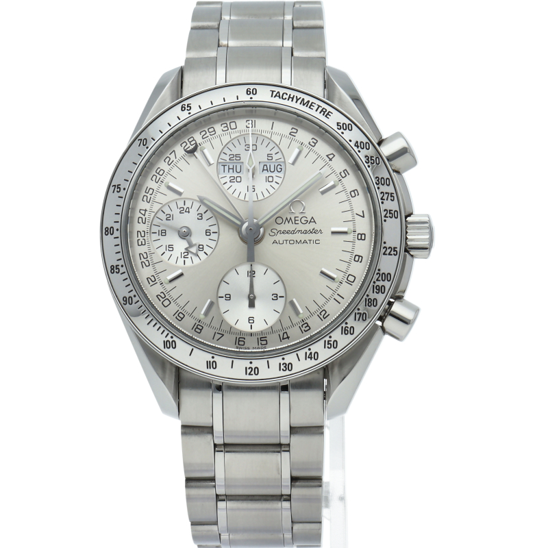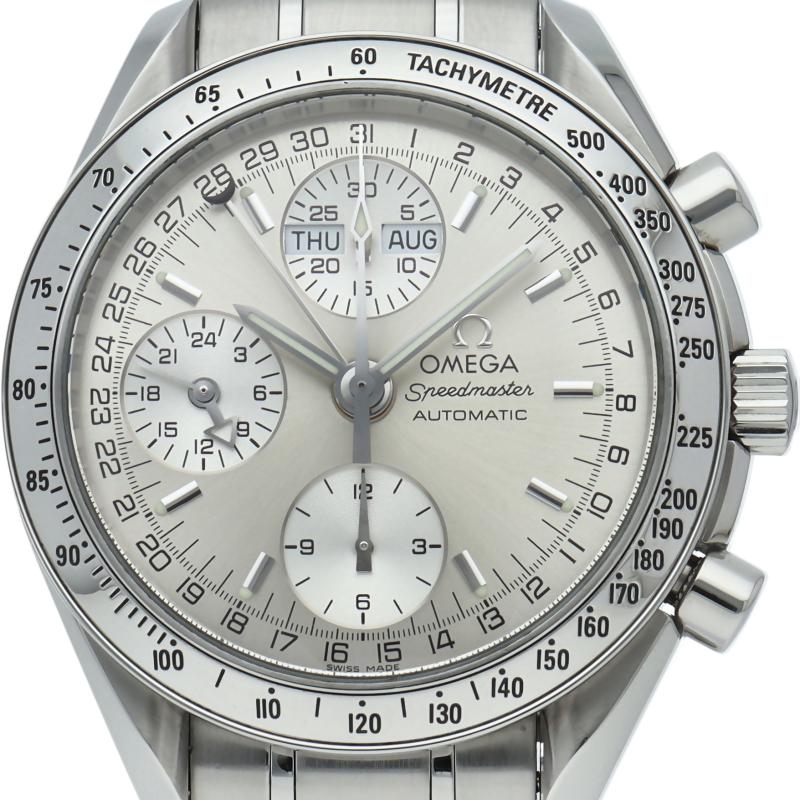 オメガの人気ウォッチ「スピードマスター」。クロノグラフ、月・日・曜日表示機能がついた便利な多機能ウォッチ。
