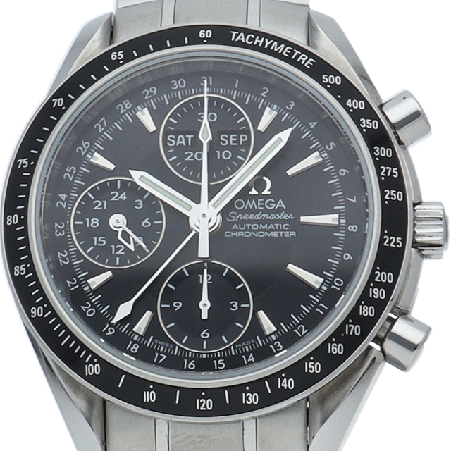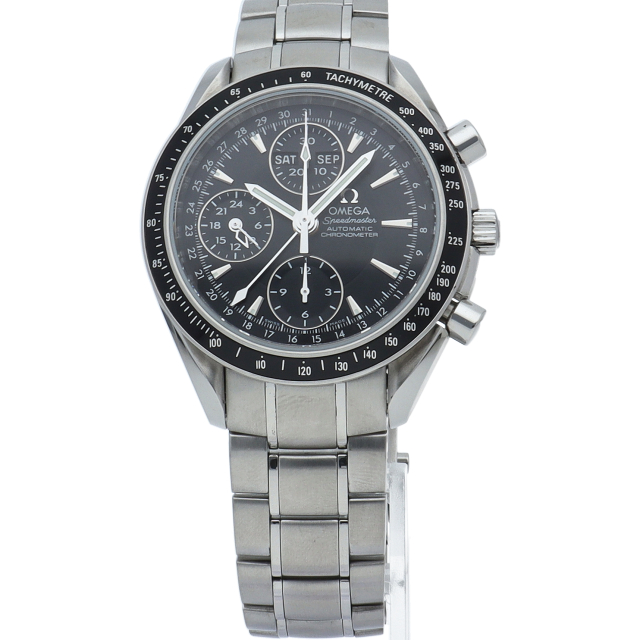 オメガの人気「スピードマスター」。クロノグラフ、月・日・曜日表示機能がついた便利な多機能ウォッチ。モデルチェンジに伴い高級感がアップした1本。