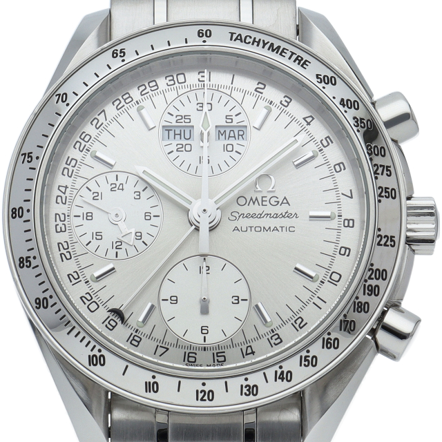 オメガの人気ウォッチ「スピードマスター」。クロノグラフ、月・日・曜日表示機能がついた便利な多機能ウォッチ。