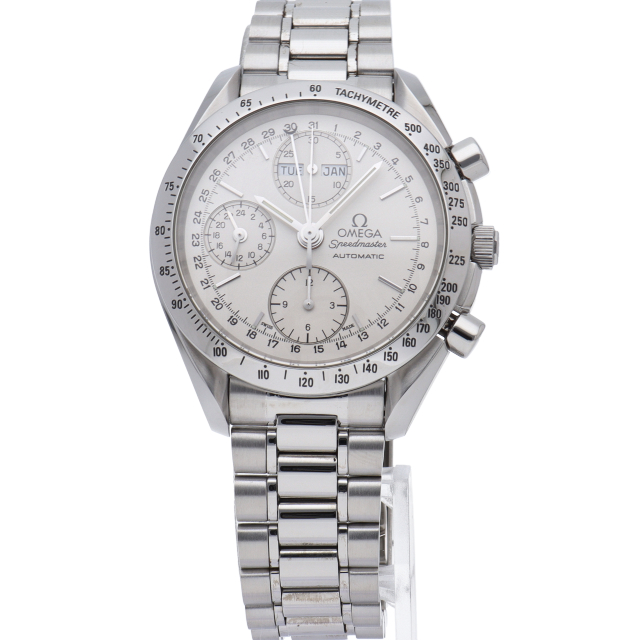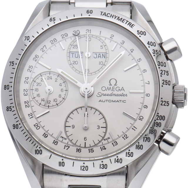 オメガの人気ウォッチ「スピードマスター」。クロノグラフ、月・日・曜日表示機能がついた便利な多機能ウォッチ。