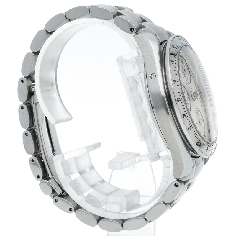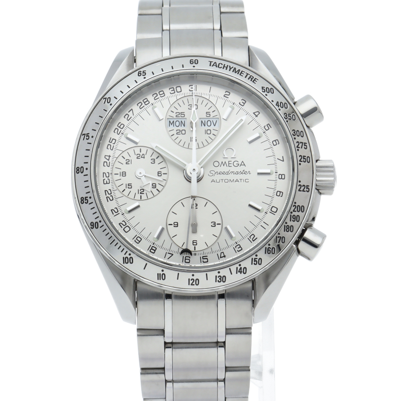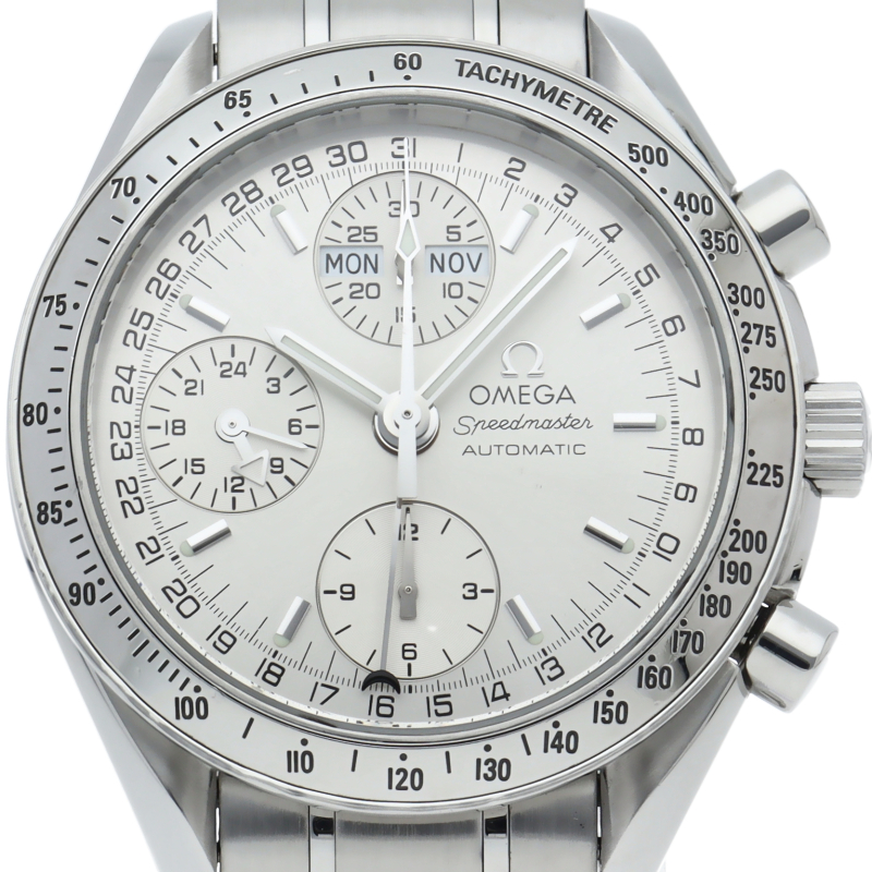 オメガの人気ウォッチ「スピードマスター」。クロノグラフ、月・日・曜日表示機能がついた便利な多機能ウォッチ。