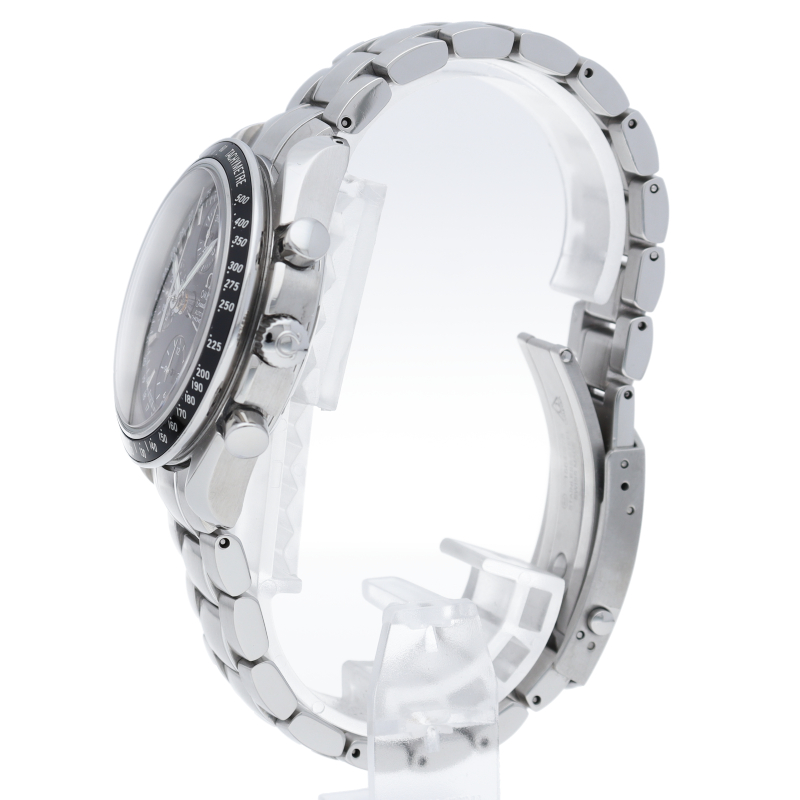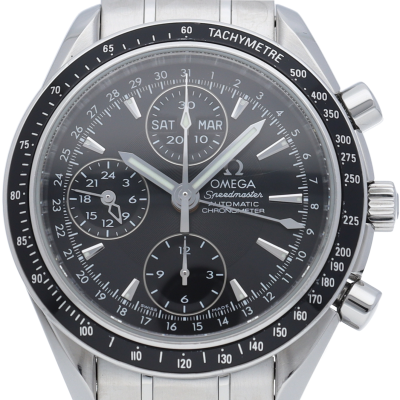 オメガの人気「スピードマスター」。クロノグラフ、月・日・曜日表示機能がついた便利な多機能ウォッチ。モデルチェンジに伴い高級感がアップした1本。