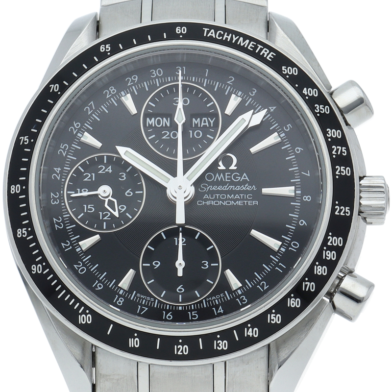オメガの人気「スピードマスター」。クロノグラフ、月・日・曜日表示機能がついた便利な多機能ウォッチ。モデルチェンジに伴い高級感がアップした1本。
