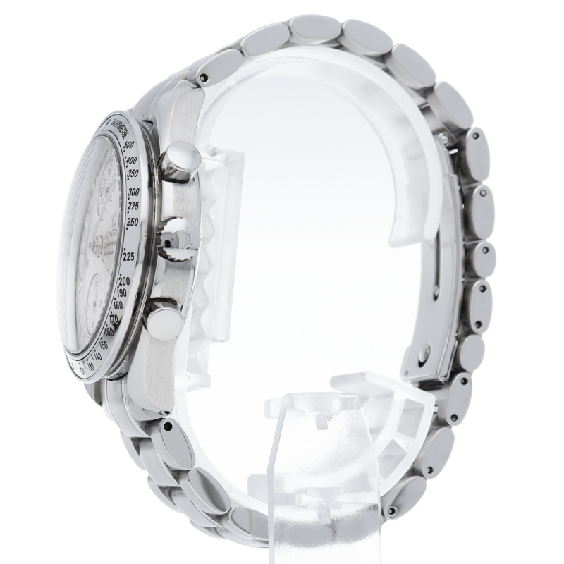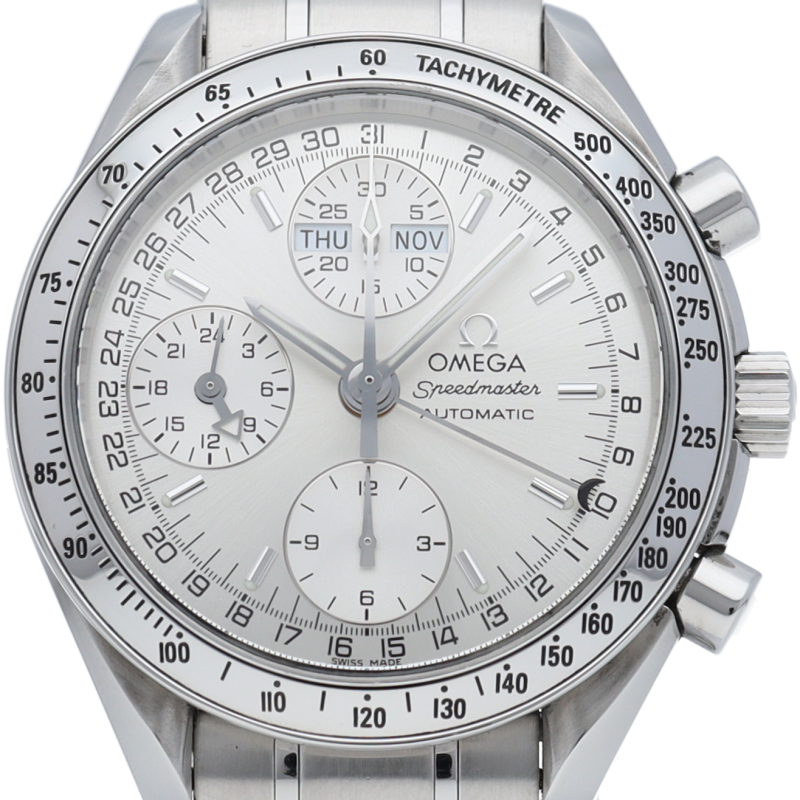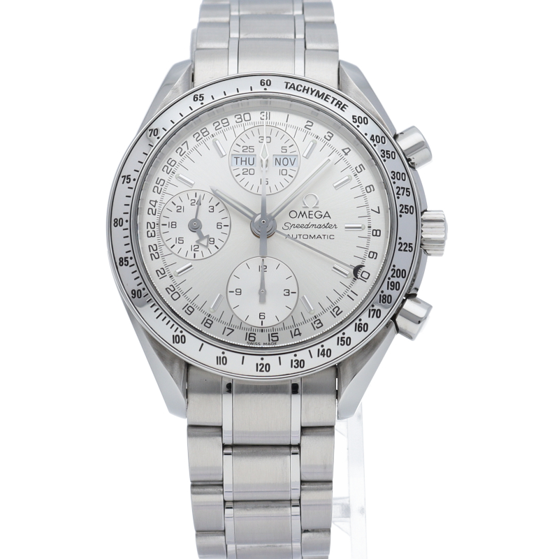 オメガの人気ウォッチ「スピードマスター」。クロノグラフ、月・日・曜日表示機能がついた便利な多機能ウォッチ。
