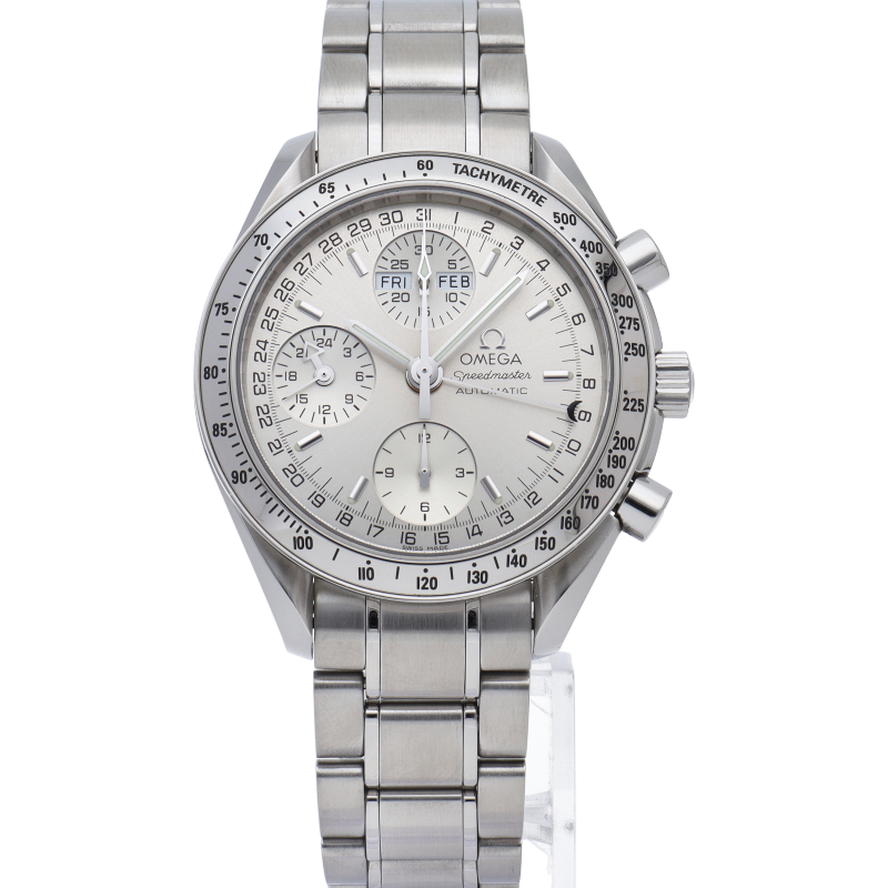 オメガの人気ウォッチ「スピードマスター」。クロノグラフ、月・日・曜日表示機能がついた便利な多機能ウォッチ。