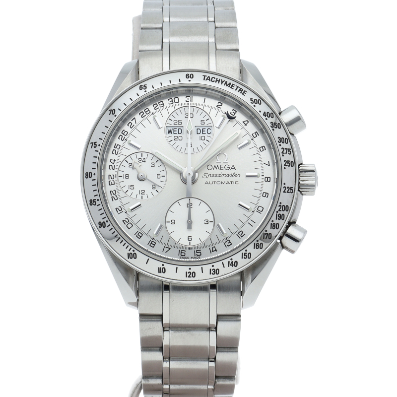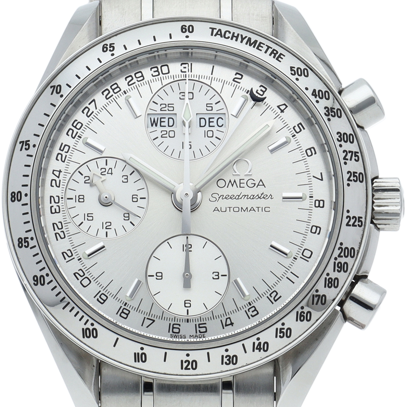 オメガの人気ウォッチ「スピードマスター」。クロノグラフ、月・日・曜日表示機能がついた便利な多機能ウォッチ。