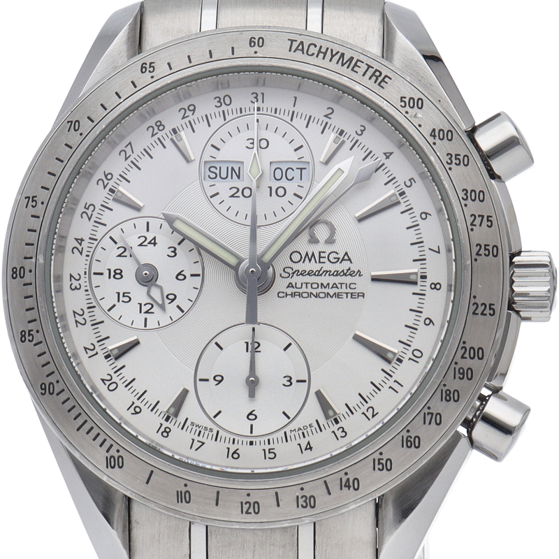 オメガの人気「スピードマスター」。クロノグラフ、月・日・曜日表示機能がついた便利な多機能ウォッチ。スタイルを選ばずにご使用いただける便利な1本。