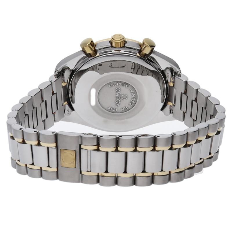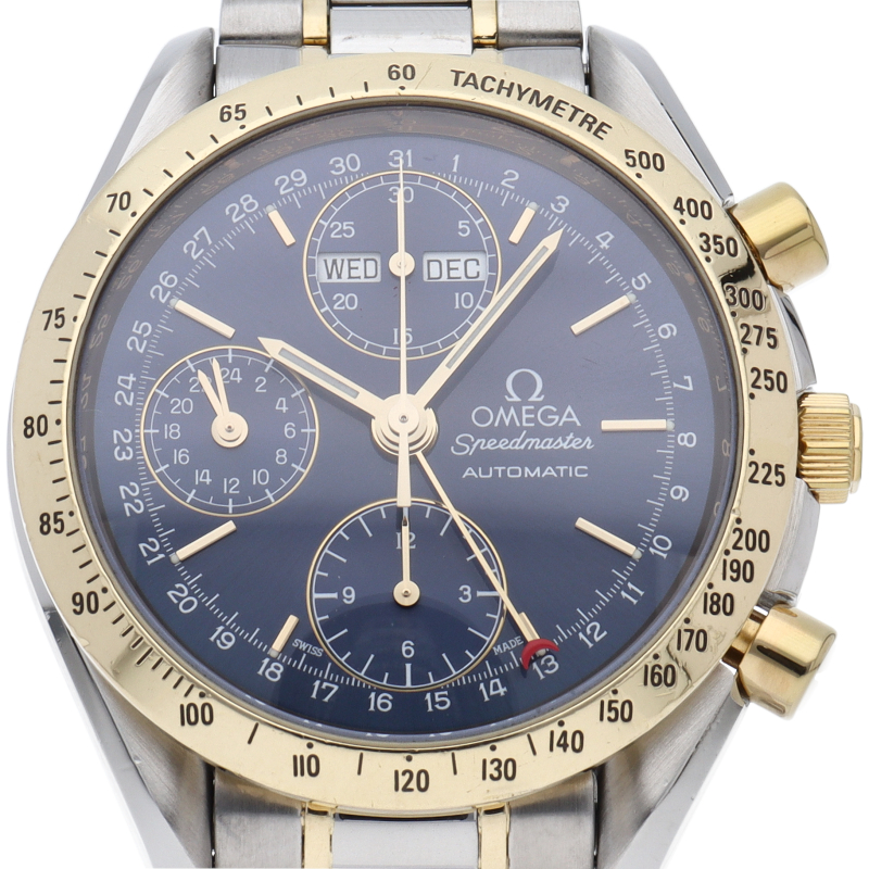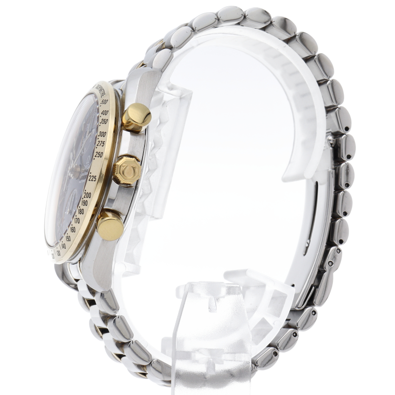 オメガの人気「スピードマスター」。クロノグラフ、月・日・曜日表示機能がついた便利な多機能ウォッチ。ステンレススティールとイエローゴールドのコンビがスポーティな雰囲気の中にも、エレガントな魅力をもった一本です