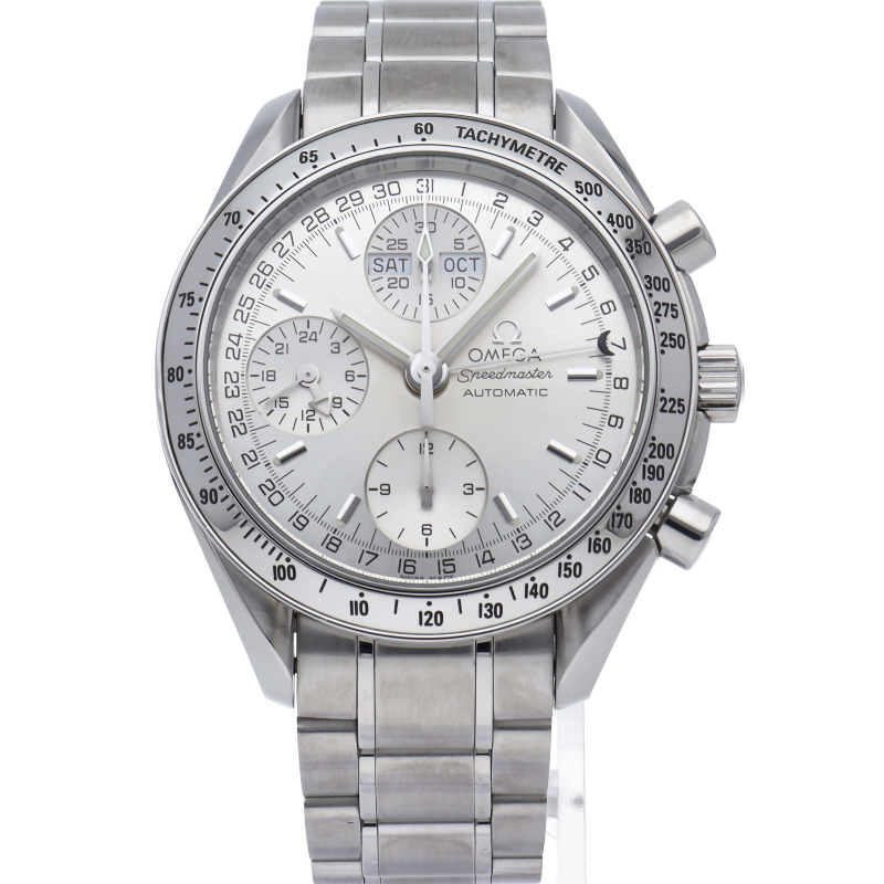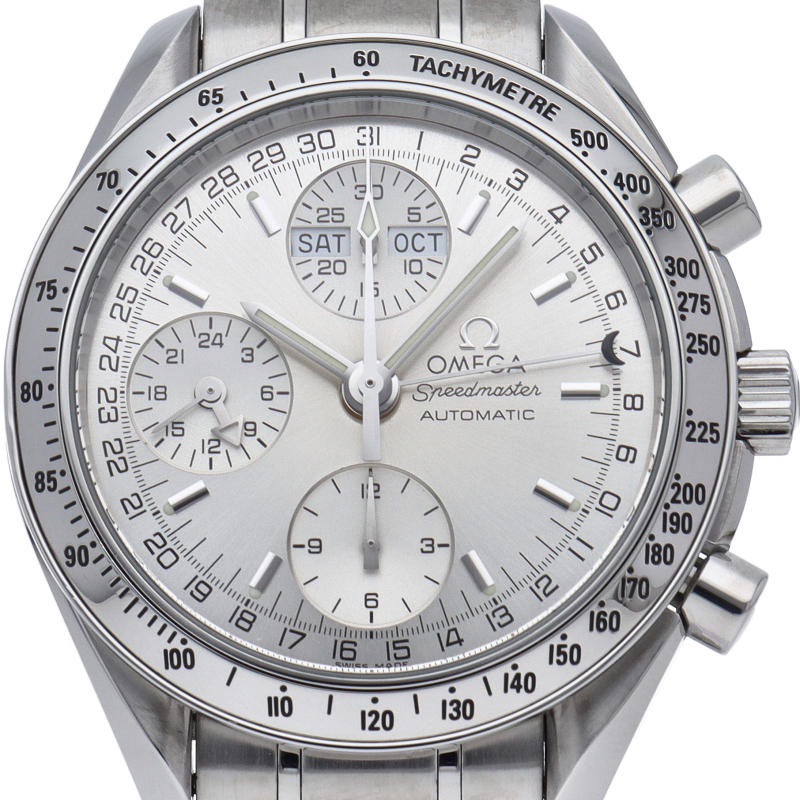 オメガの人気ウォッチ「スピードマスター」。クロノグラフ、月・日・曜日表示機能がついた便利な多機能ウォッチ。