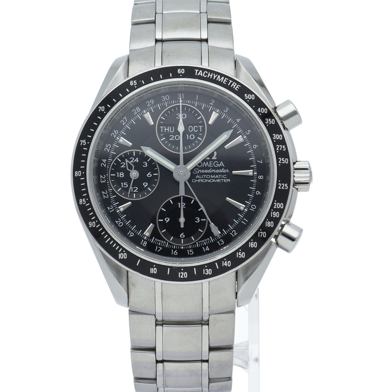 オメガの人気「スピードマスター」。クロノグラフ、月・日・曜日表示機能がついた便利な多機能ウォッチ。モデルチェンジに伴い高級感がアップした1本。