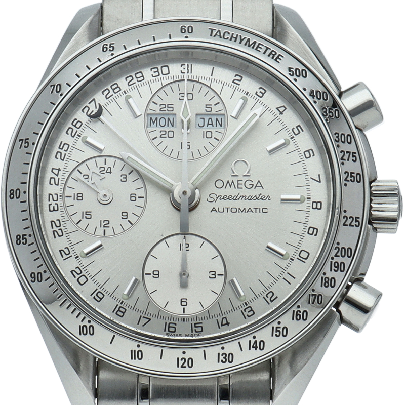 オメガの人気ウォッチ「スピードマスター」。クロノグラフ、月・日・曜日表示機能がついた便利な多機能ウォッチ。