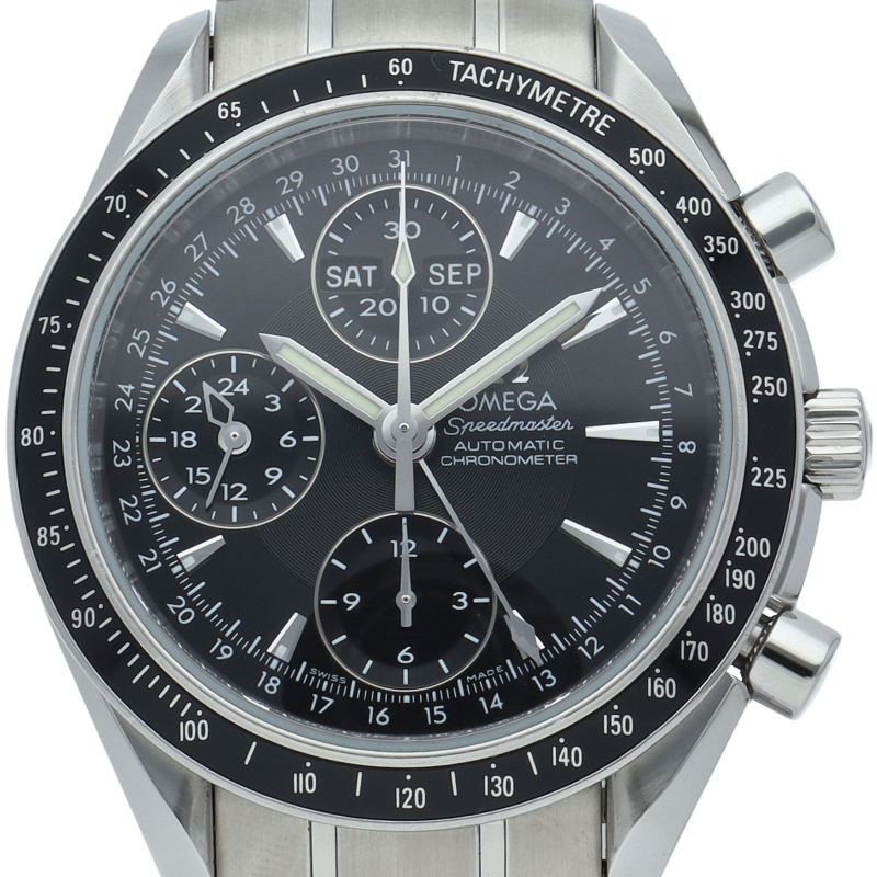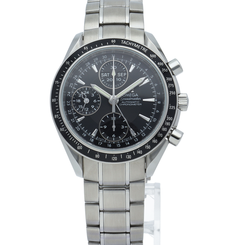 オメガの人気「スピードマスター」。クロノグラフ、月・日・曜日表示機能がついた便利な多機能ウォッチ。モデルチェンジに伴い高級感がアップした1本。