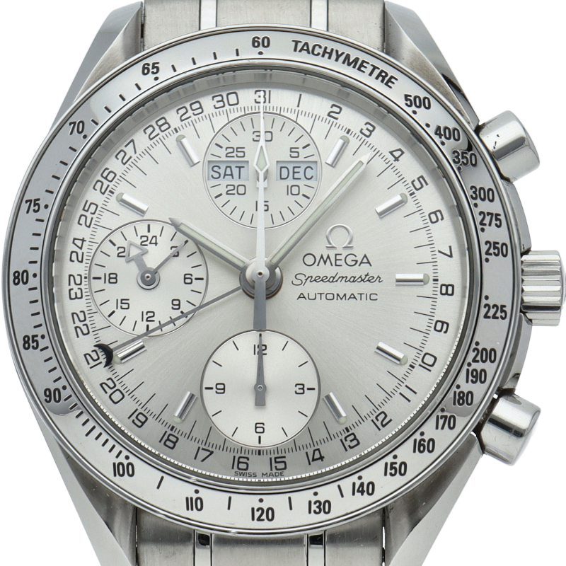 オメガの人気ウォッチ「スピードマスター」。クロノグラフ、月・日・曜日表示機能がついた便利な多機能ウォッチ。