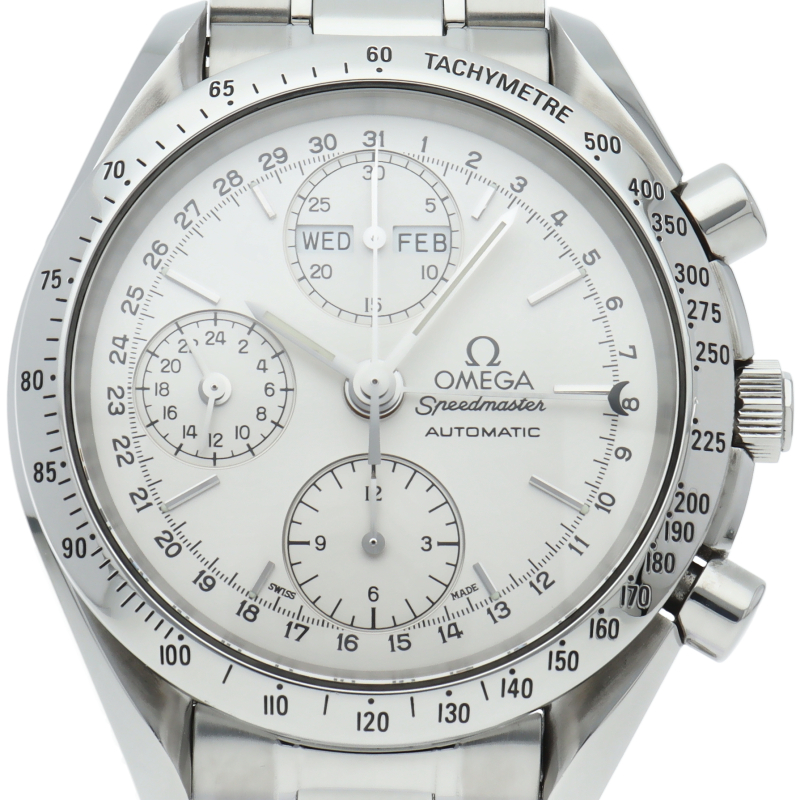 オメガの人気ウォッチ「スピードマスター」。クロノグラフ、月・日・曜日表示機能がついた便利な多機能ウォッチ。