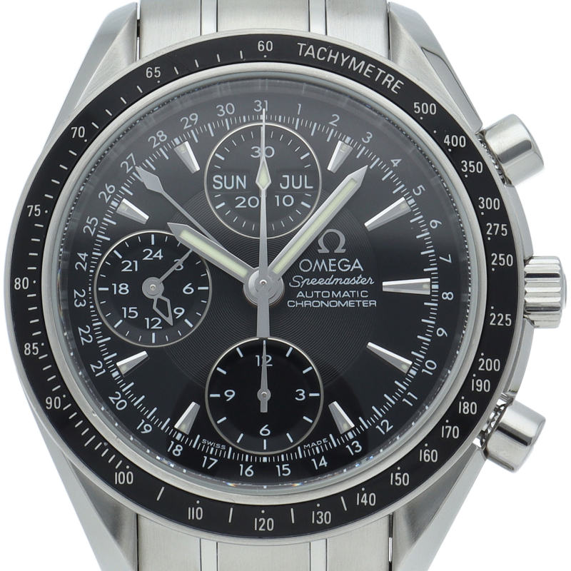オメガの人気「スピードマスター」。クロノグラフ、月・日・曜日表示機能がついた便利な多機能ウォッチ。モデルチェンジに伴い高級感がアップした1本。