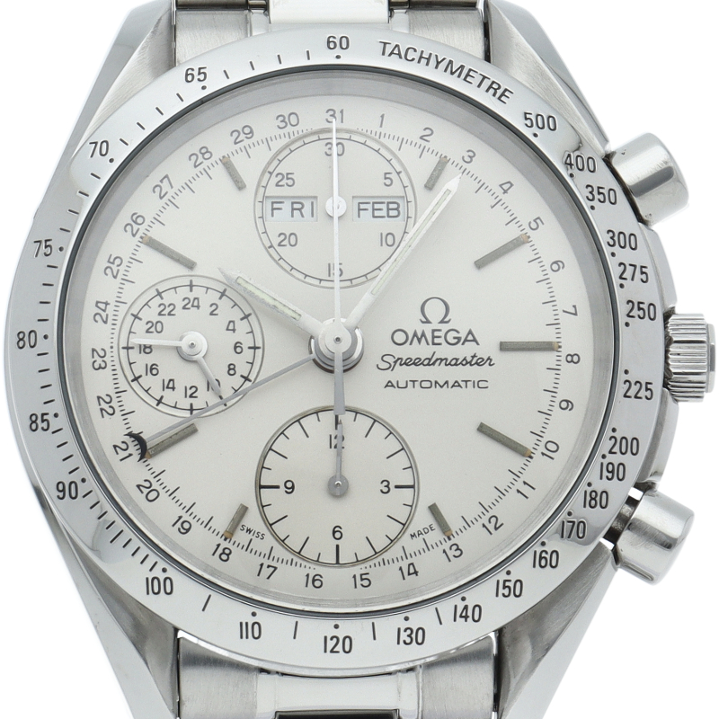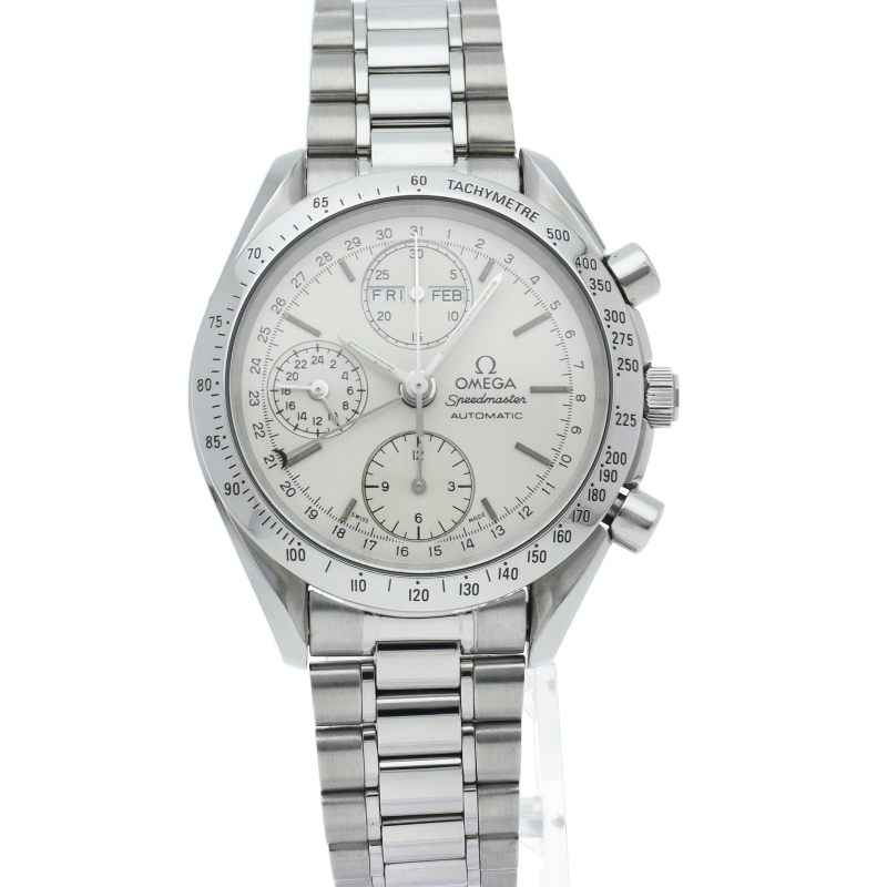 オメガの人気ウォッチ「スピードマスター」。クロノグラフ、月・日・曜日表示機能がついた便利な多機能ウォッチ。